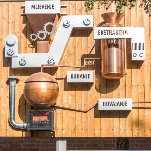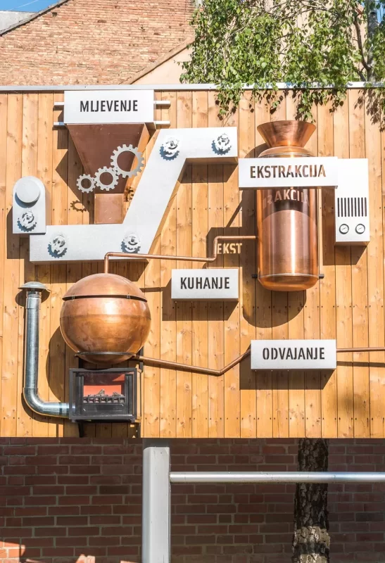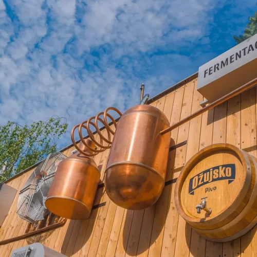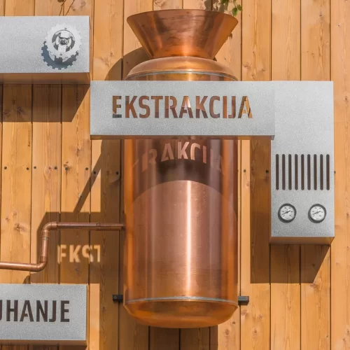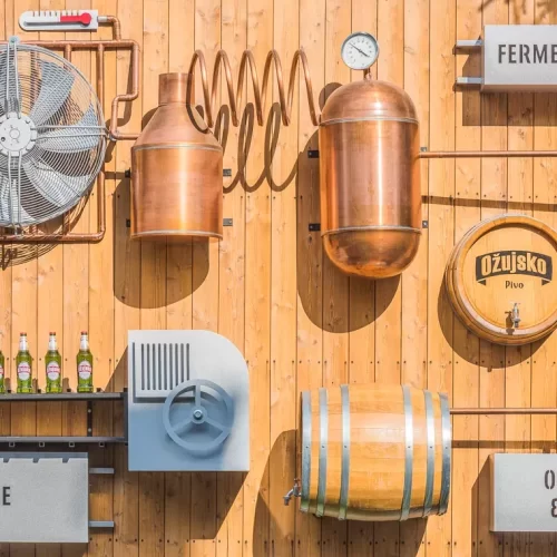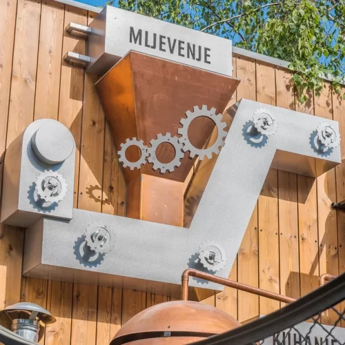 At the entrance to the central plant of Zagreb Brewery, we installed a 3D moving big board which shows the production process of Ožujski pivo. We designed it entirely independently and made it using solid wood for the entire base. bigboard, copper and zinc sheet for making 3D production elements and zinc sheet for making 3D signs. When lit, individual elements on bigboard they turn, rotate and light up.