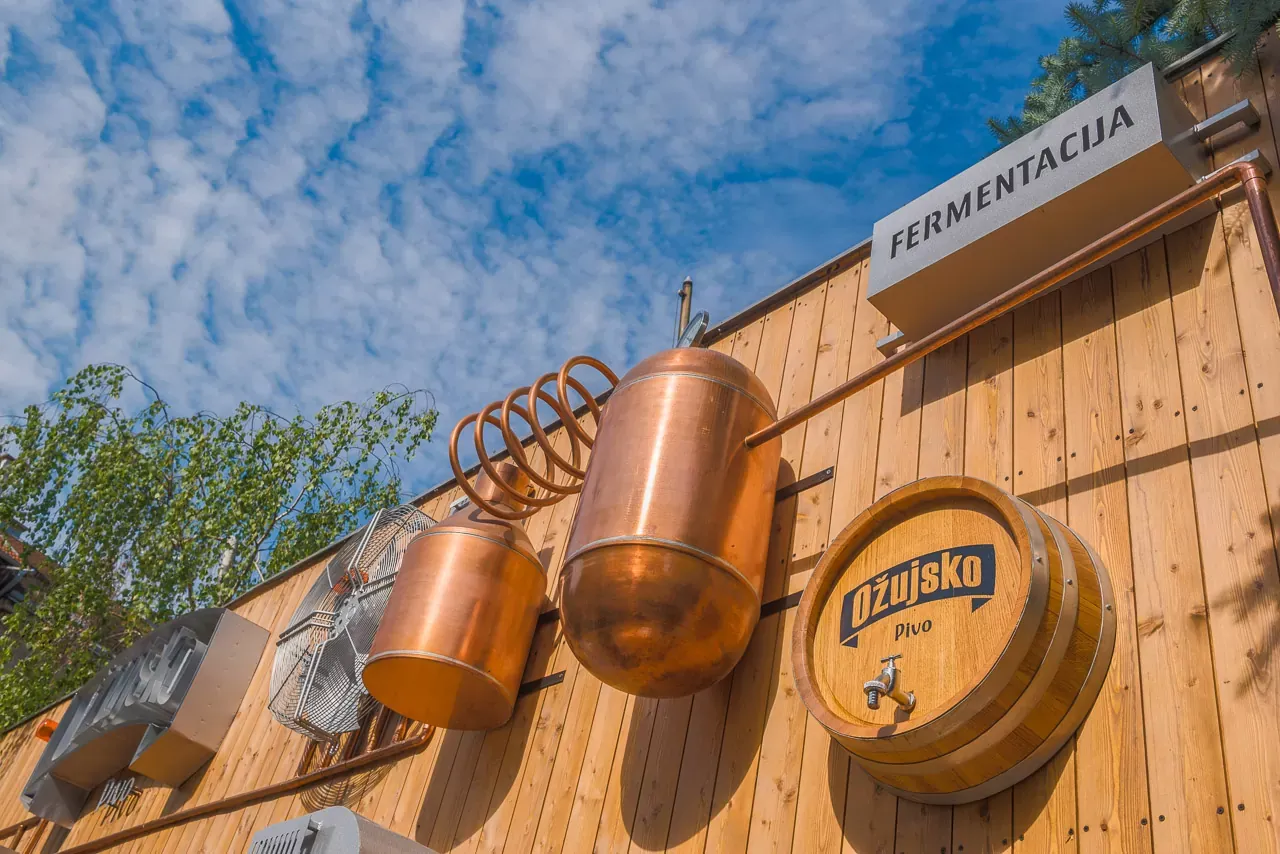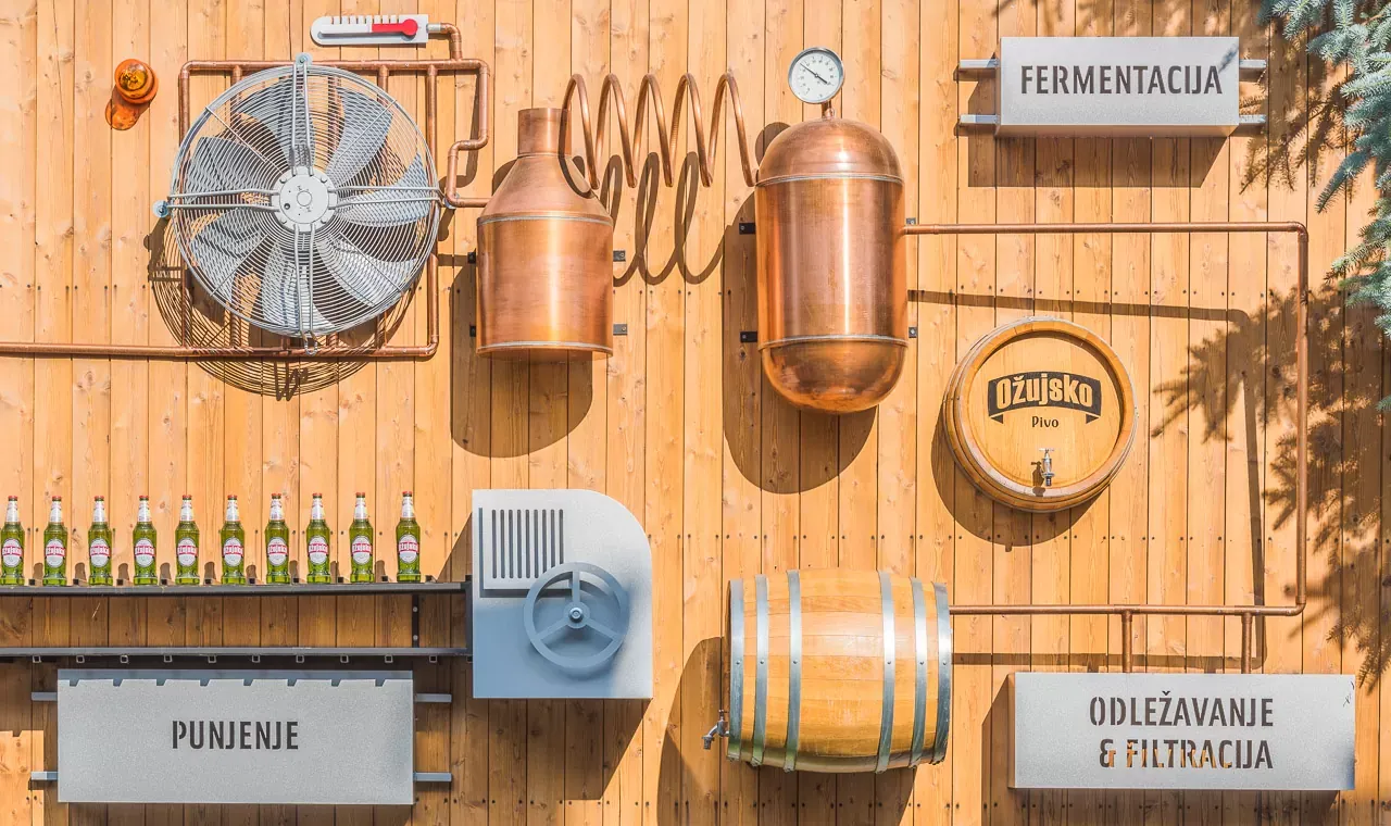 At the entrance to the central plant of Zagreb Brewery, we installed a 3D moving big board which shows the production process of Ožujski pivo. We designed it entirely independently and made it using solid wood for the entire base. bigboard, copper and zinc sheet for making 3D production elements and zinc sheet for making 3D signs. When lit, individual elements on bigboard they turn, rotate and light up.