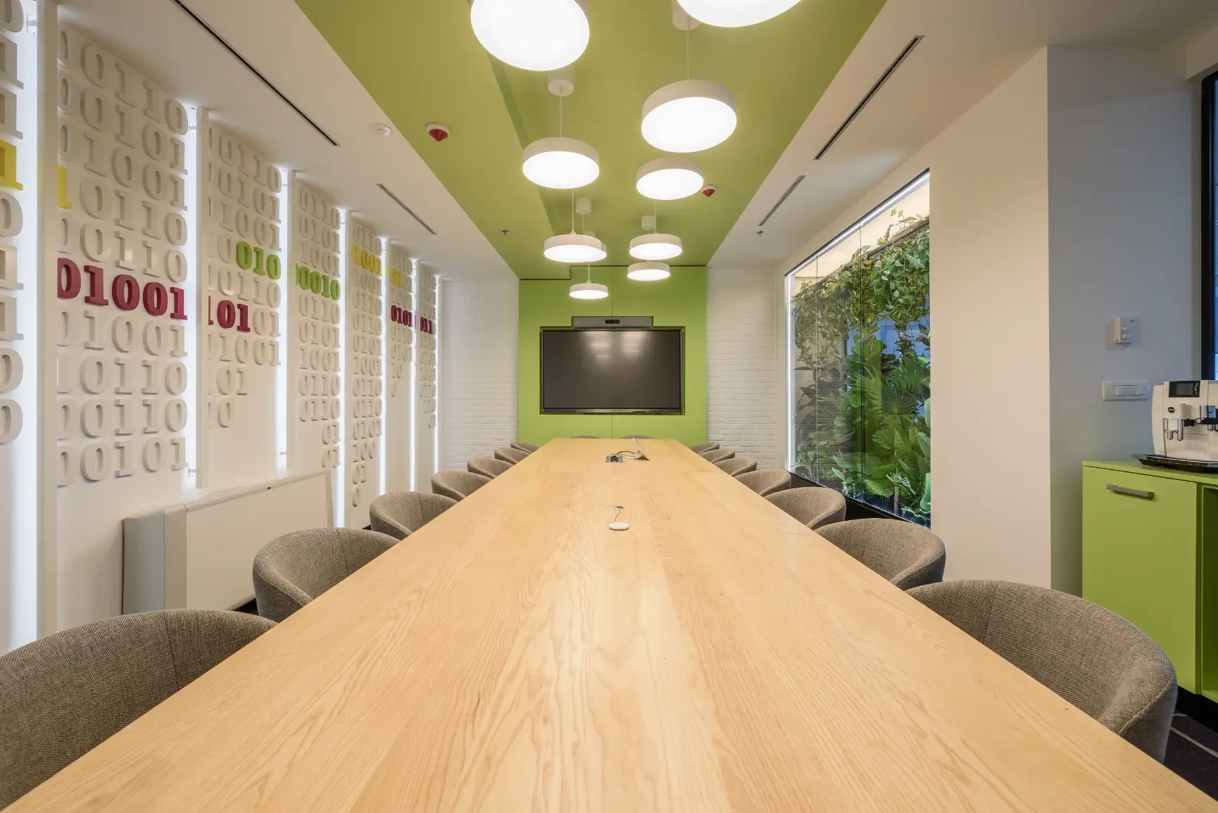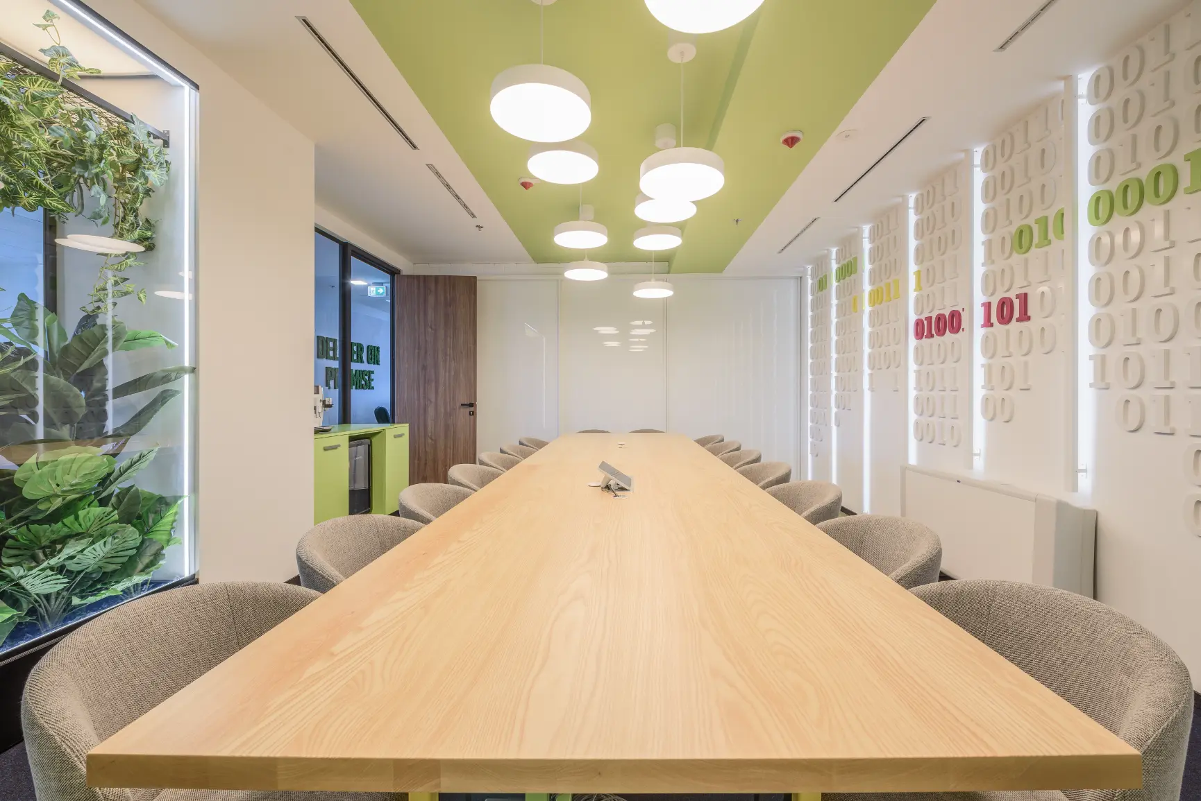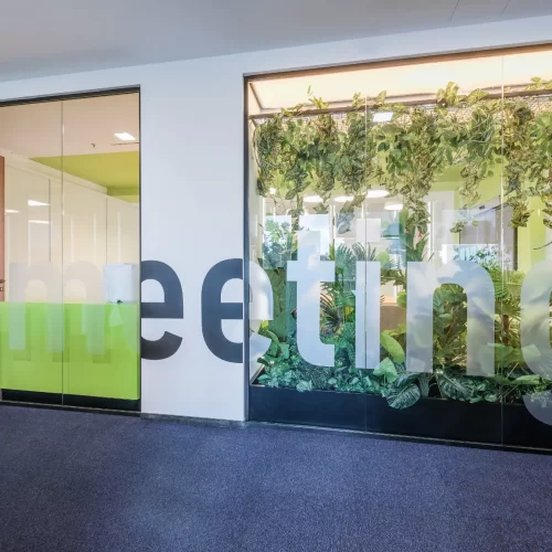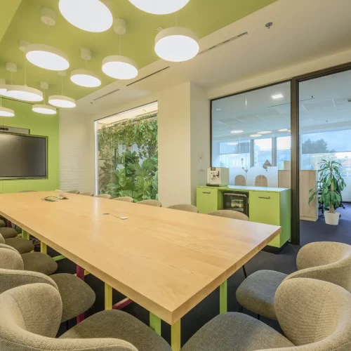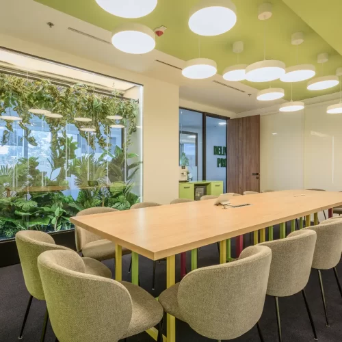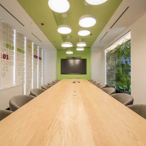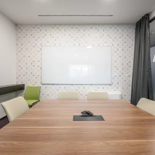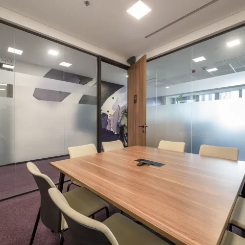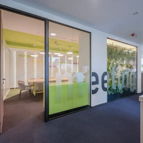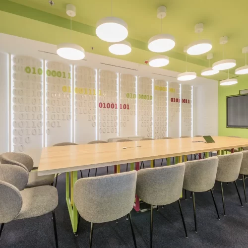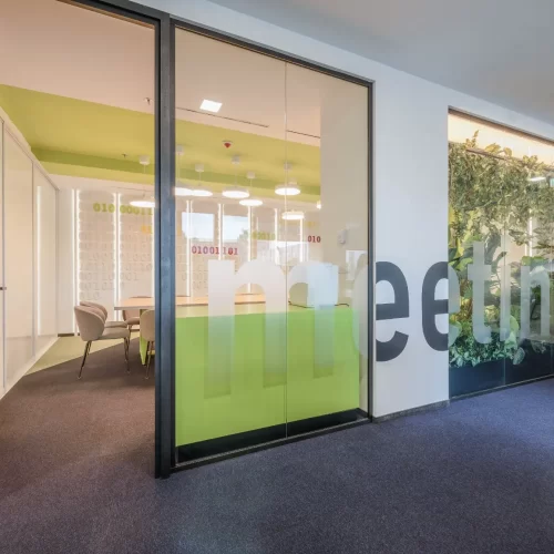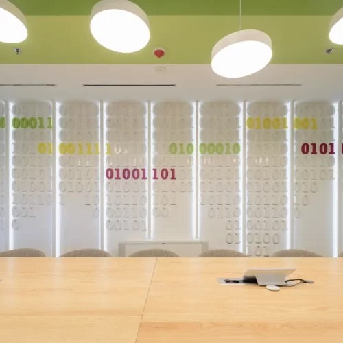 Za jednu od najvećih ICT kompanija u regiji dizajnirali smo i proizveli inventar za uredske prostore. Centralna prostorija bila je konferencijska soba Uprave u kojoj smo koristili binarni kod kao noseći dekorativni element, dok smo veliku staklenu nišu iskoristili za izradu „terarija“ sa zelenilom i dekorativnom rasvjetom. Konferencijski stol izveden je od masiva sa željeznom osnovom, a paneli za brainstorming izvedeni su kao klizni stakleni paneli u punoj visini i širini prostorije. Uz konferencijsku sobu, svi uredi na dva kata opremljeni su dekorativnim i funkcionalnim elementima, dok je ulaz na katu Uprave naglašen velikim welcome zidom izvedenim od kombinacije masivnog drveta, dehidriranog zelenila i 3D backlight logotipa.