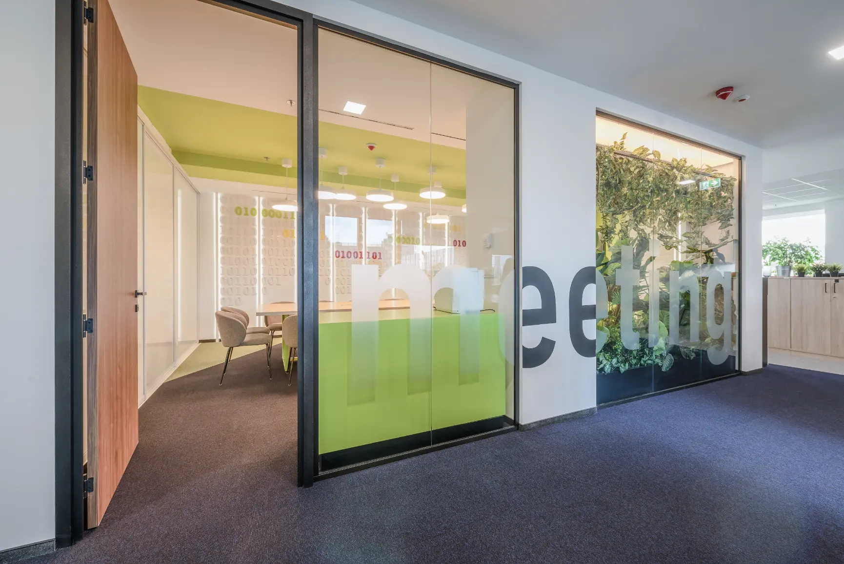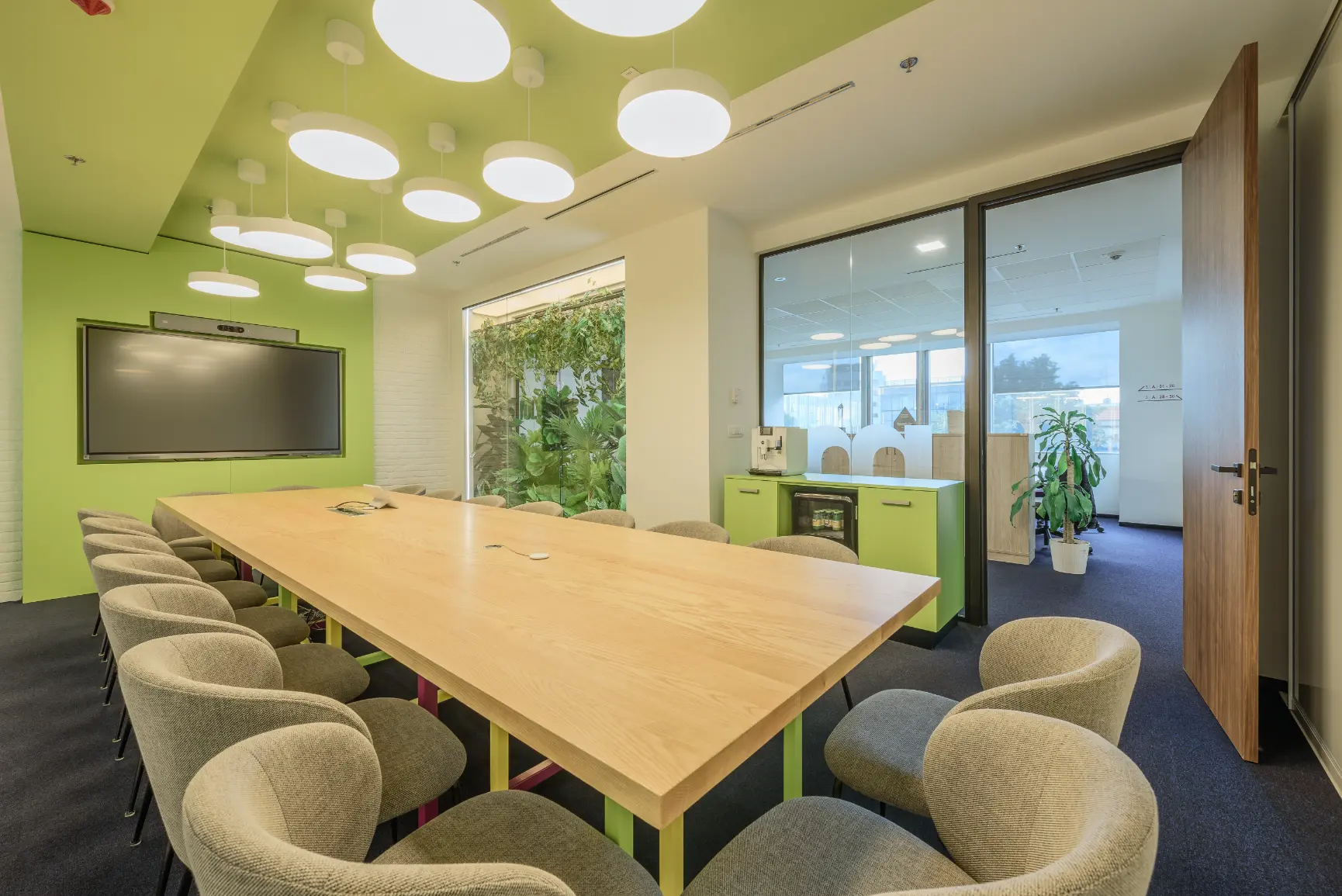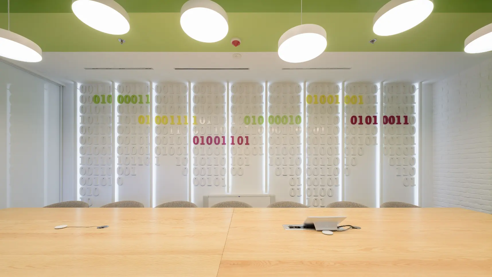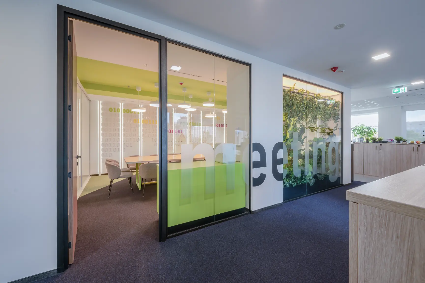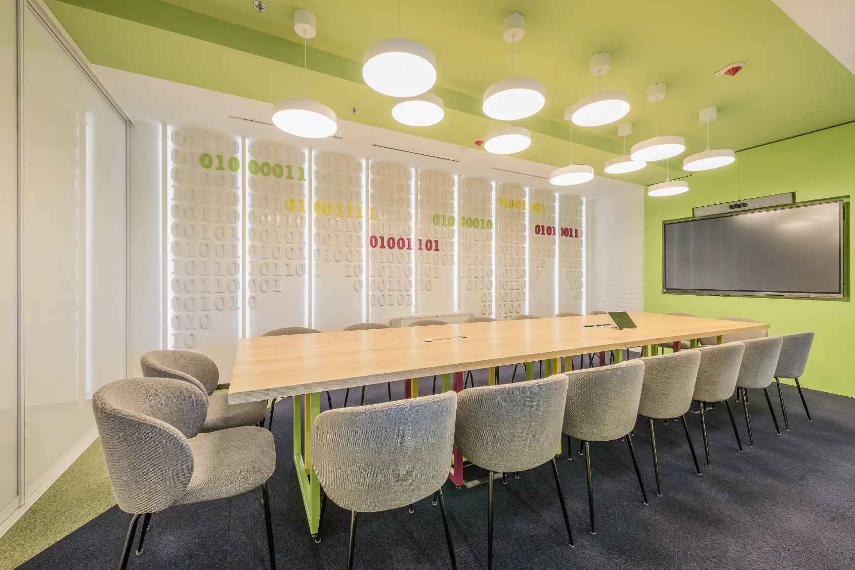Za jednu od najvećih ICT kompanija u regiji dizajnirali smo i proizveli inventar za uredske prostore. Centralna prostorija bila je konferencijska soba Uprave u kojoj smo koristili binarni kod kao noseći dekorativni element, dok smo veliku staklenu nišu iskoristili za izradu „terarija“ sa zelenilom i dekorativnom rasvjetom. Konferencijski stol izveden je od masiva sa željeznom osnovom, a paneli za brainstorming izvedeni su kao klizni stakleni paneli u punoj visini i širini prostorije. Uz konferencijsku sobu, svi uredi na dva kata opremljeni su dekorativnim i funkcionalnim elementima, dok je ulaz na katu Uprave naglašen velikim welcome zidom izvedenim od kombinacije masivnog drveta, dehidriranog zelenila i 3D backlight logotipa.