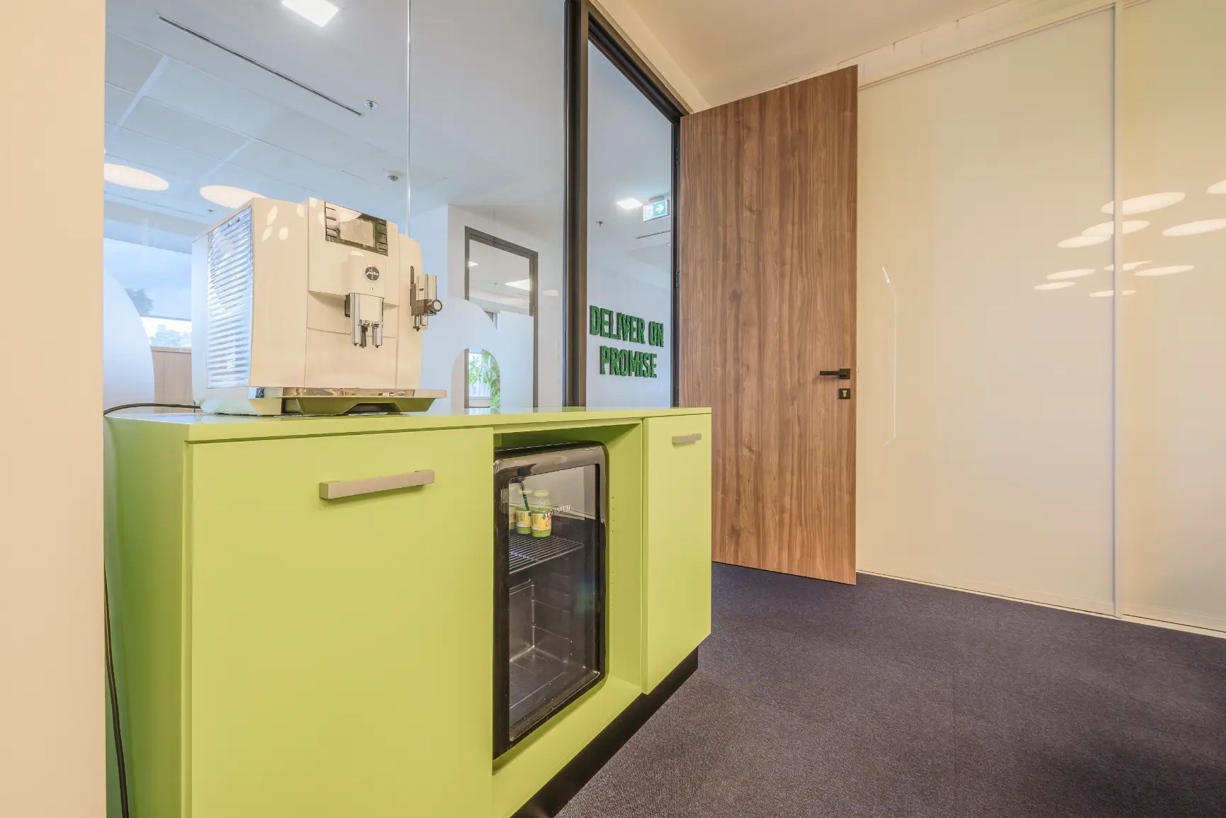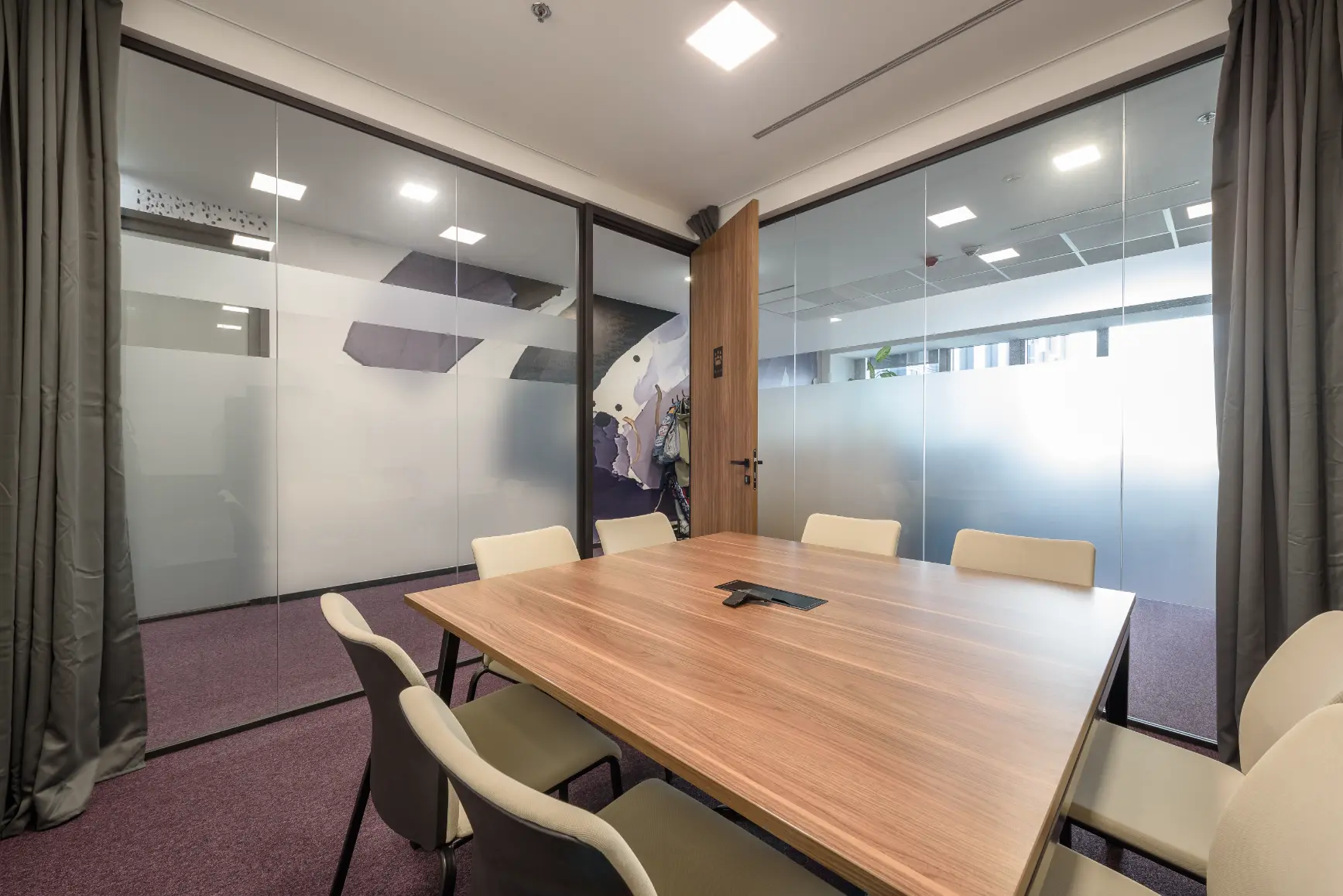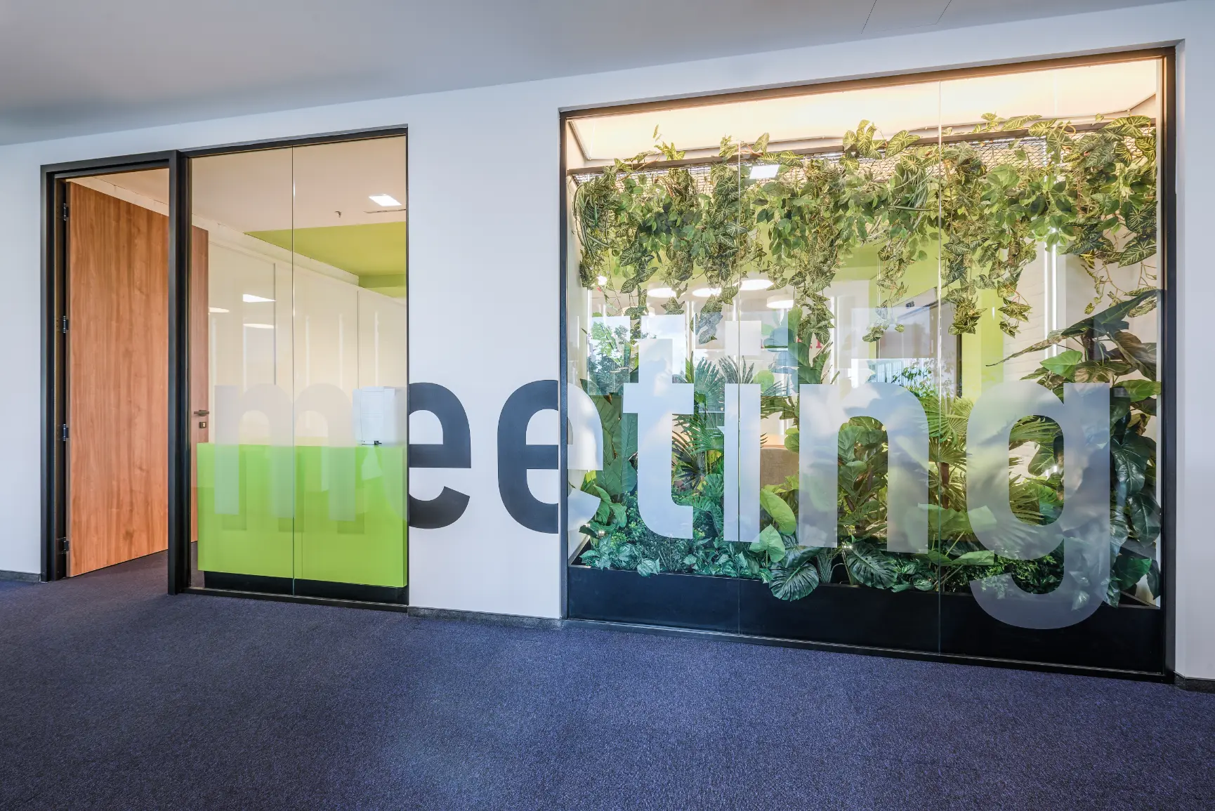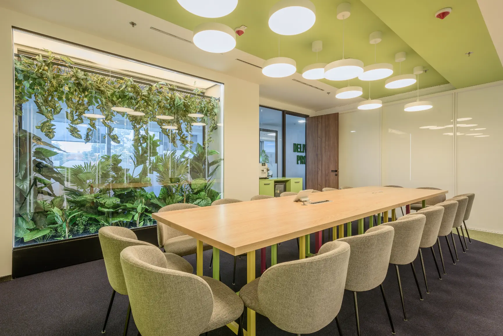 Za jednu od najvećih ICT kompanija u regiji dizajnirali smo i proizveli inventar za uredske prostore. Centralna prostorija bila je konferencijska soba Uprave u kojoj smo koristili binarni kod kao noseći dekorativni element, dok smo veliku staklenu nišu iskoristili za izradu „terarija“ sa zelenilom i dekorativnom rasvjetom. Konferencijski stol izveden je od masiva sa željeznom osnovom, a paneli za brainstorming izvedeni su kao klizni stakleni paneli u punoj visini i širini prostorije. Uz konferencijsku sobu, svi uredi na dva kata opremljeni su dekorativnim i funkcionalnim elementima, dok je ulaz na katu Uprave naglašen velikim welcome zidom izvedenim od kombinacije masivnog drveta, dehidriranog zelenila i 3D backlight logotipa.