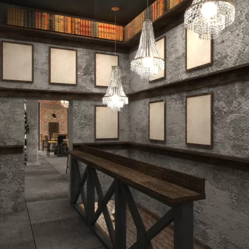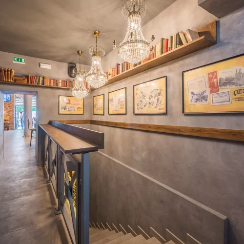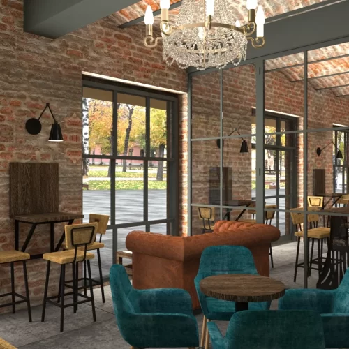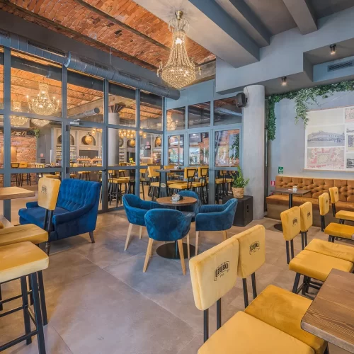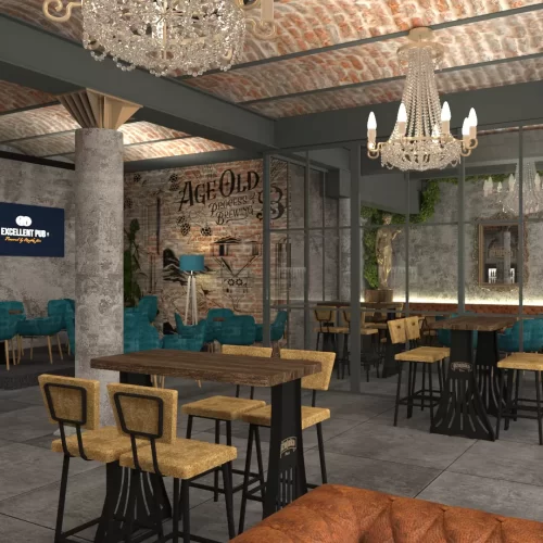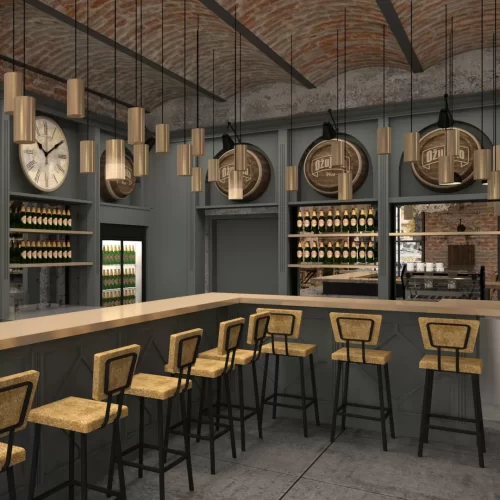 Smjer uređenja definiran je stoga prema poslovnom modelu kojeg smo nazvali „pivska kavana“ i prostorom dominiraju „grube“ bazične obrade zidova i stropova, što smo postigli skidanjem knauf obloga i otvaranjem starih ciglenih svodova. Kako bi ambijent zadovoljio oba ugostiteljska smjera, ovim „grubim“ oblogama ravnotežu smo dali izradom inventara u plavim i sivim tonovima, s akcentima u brušenom mesingu te korištenjem tekstura poput mat lakiranih drvenih površina i baršuna uz pozicioniranje tople rasvjete u stilskim lusterima. Kompletan inventar prostora – od funkcionalnog do dekorativnog – u potpunosti je dizajniran i izrađen u L&L proizvodnom pogonu.