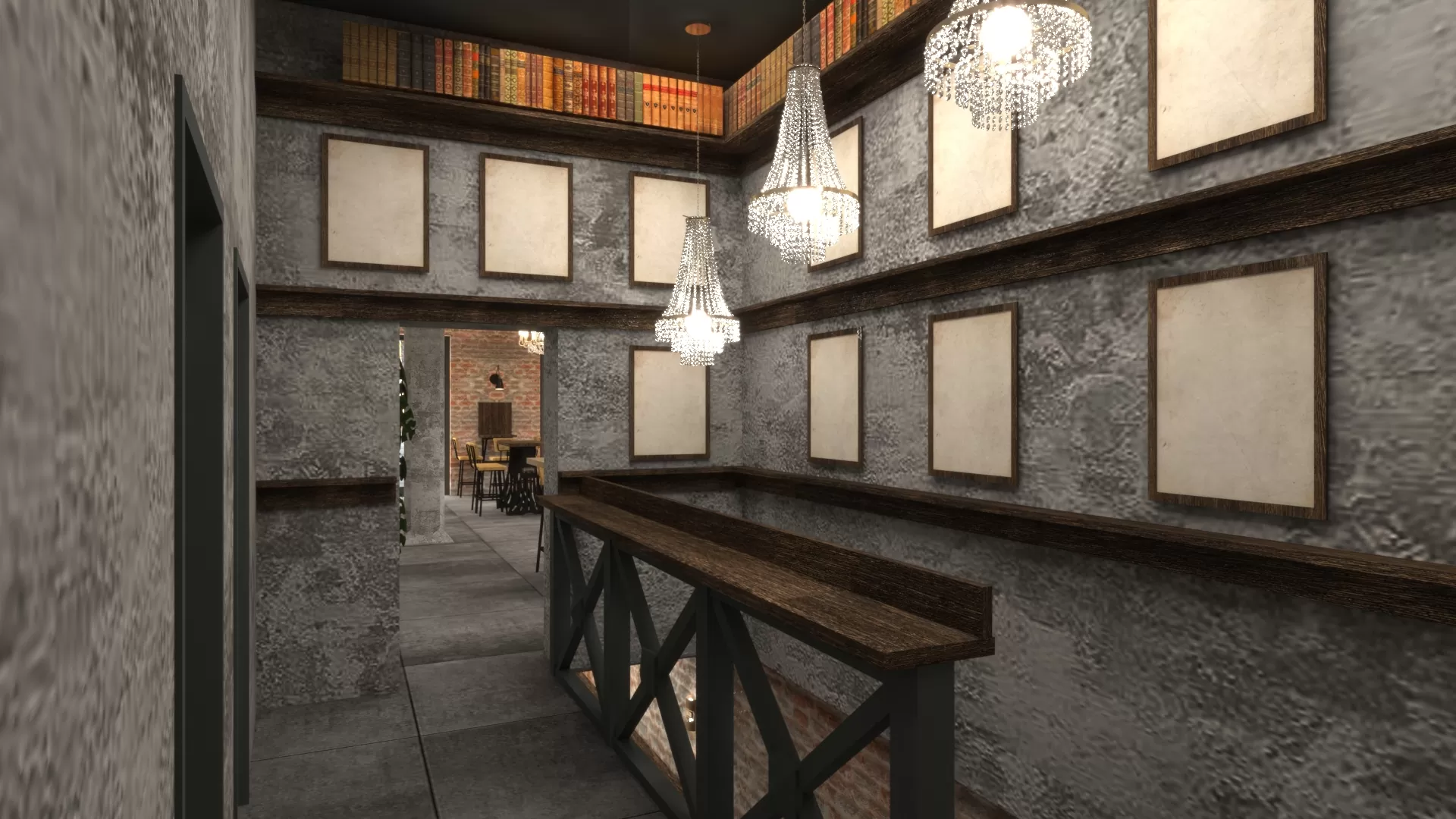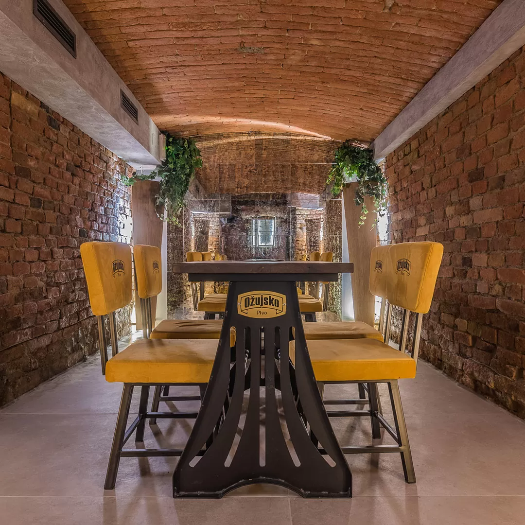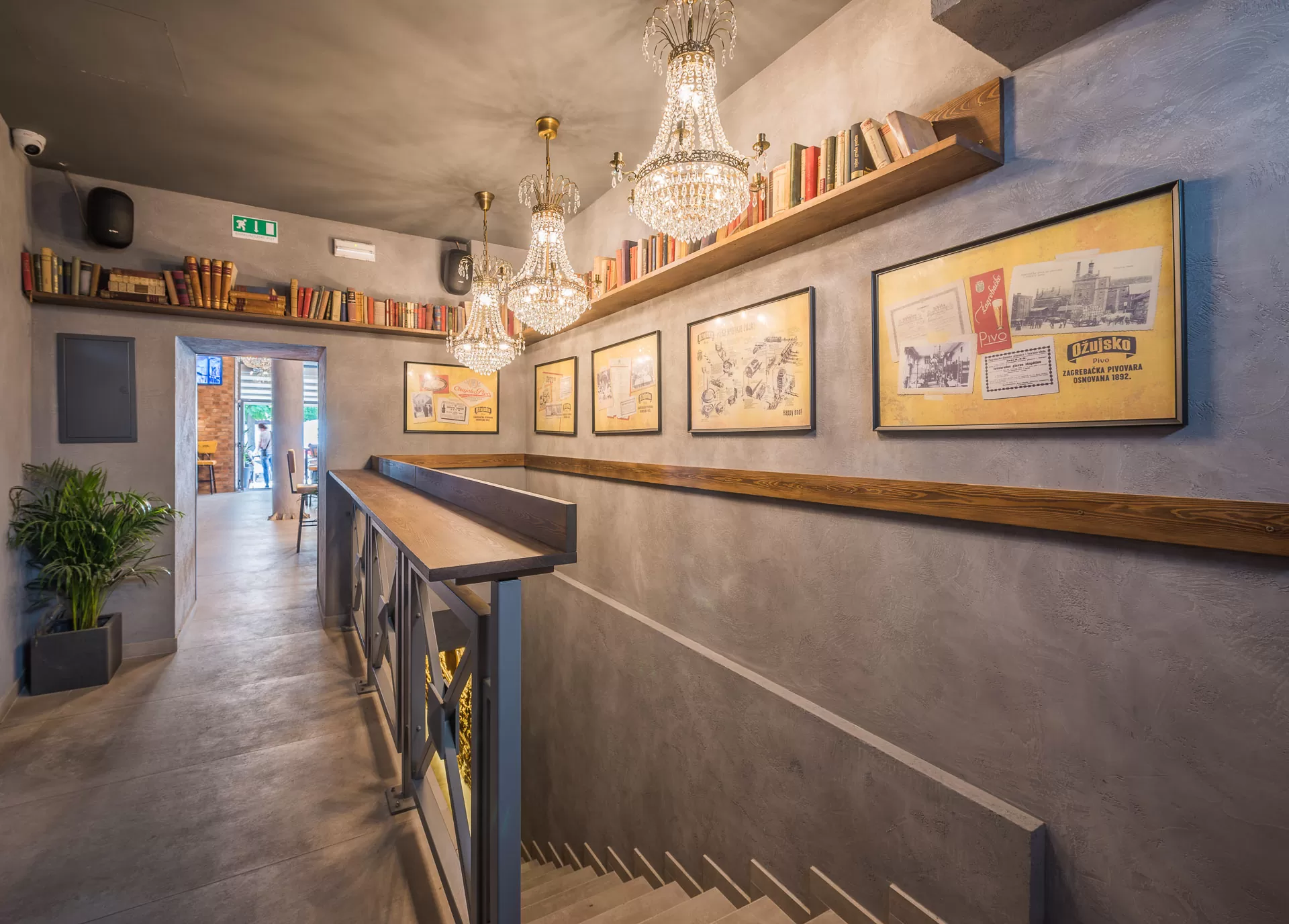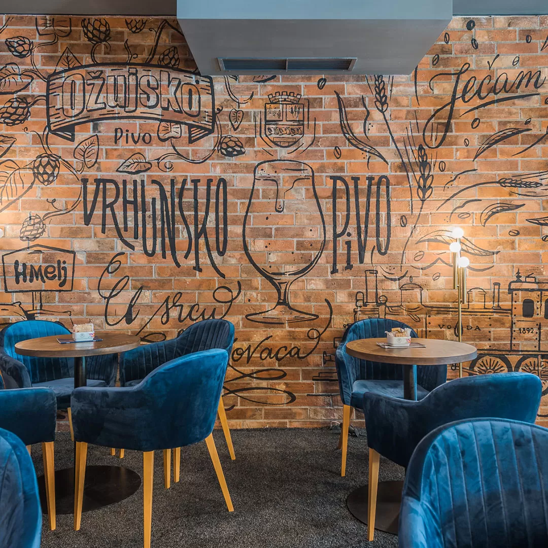 Smjer uređenja definiran je stoga prema poslovnom modelu kojeg smo nazvali „pivska kavana“ i prostorom dominiraju „grube“ bazične obrade zidova i stropova, što smo postigli skidanjem knauf obloga i otvaranjem starih ciglenih svodova. Kako bi ambijent zadovoljio oba ugostiteljska smjera, ovim „grubim“ oblogama ravnotežu smo dali izradom inventara u plavim i sivim tonovima, s akcentima u brušenom mesingu te korištenjem tekstura poput mat lakiranih drvenih površina i baršuna uz pozicioniranje tople rasvjete u stilskim lusterima. Kompletan inventar prostora – od funkcionalnog do dekorativnog – u potpunosti je dizajniran i izrađen u L&L proizvodnom pogonu.