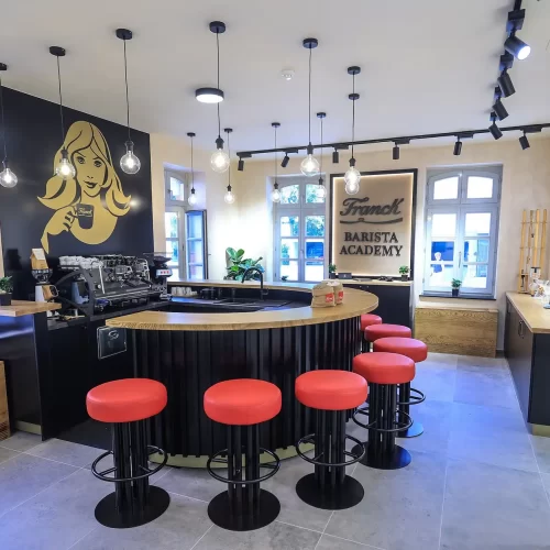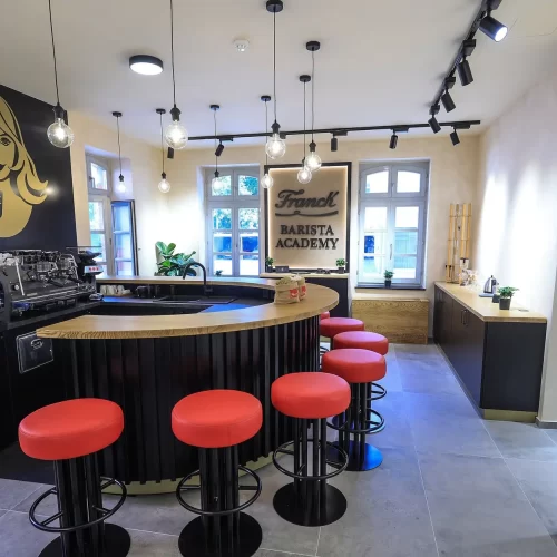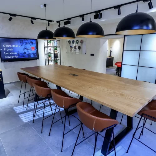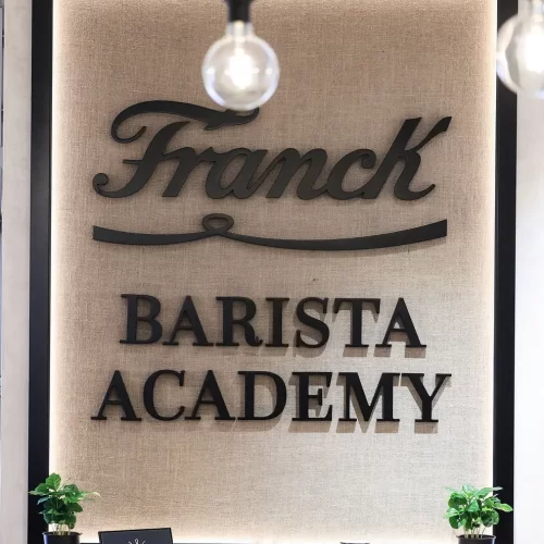 S ciljem promicanja kulture ispijanja kave i čaja te podizanja profesionalnih standarda ugostiteljstva, prostor smo u startu zamislili kao funkcionalan, moderan i otvoren, s naglaskom na edukaciju i neometanu komunikaciju polaznika s Franck baristima. Prostor je funkcionalno podijeljen u dvije cjeline – ulazni prostor kojim dominira polukružni šank opremljen najsuvremenijom profesionalnom opremom, dok je druga prostorija osmišljena kao edukacijska te se u njoj nalazi predimenzionirani barski stol s kružnim sjedenjem kao osnova prostorije, dodatno naglašen ručno izrađenim metalnim lusterima.