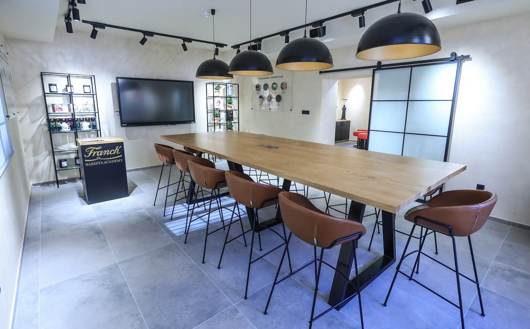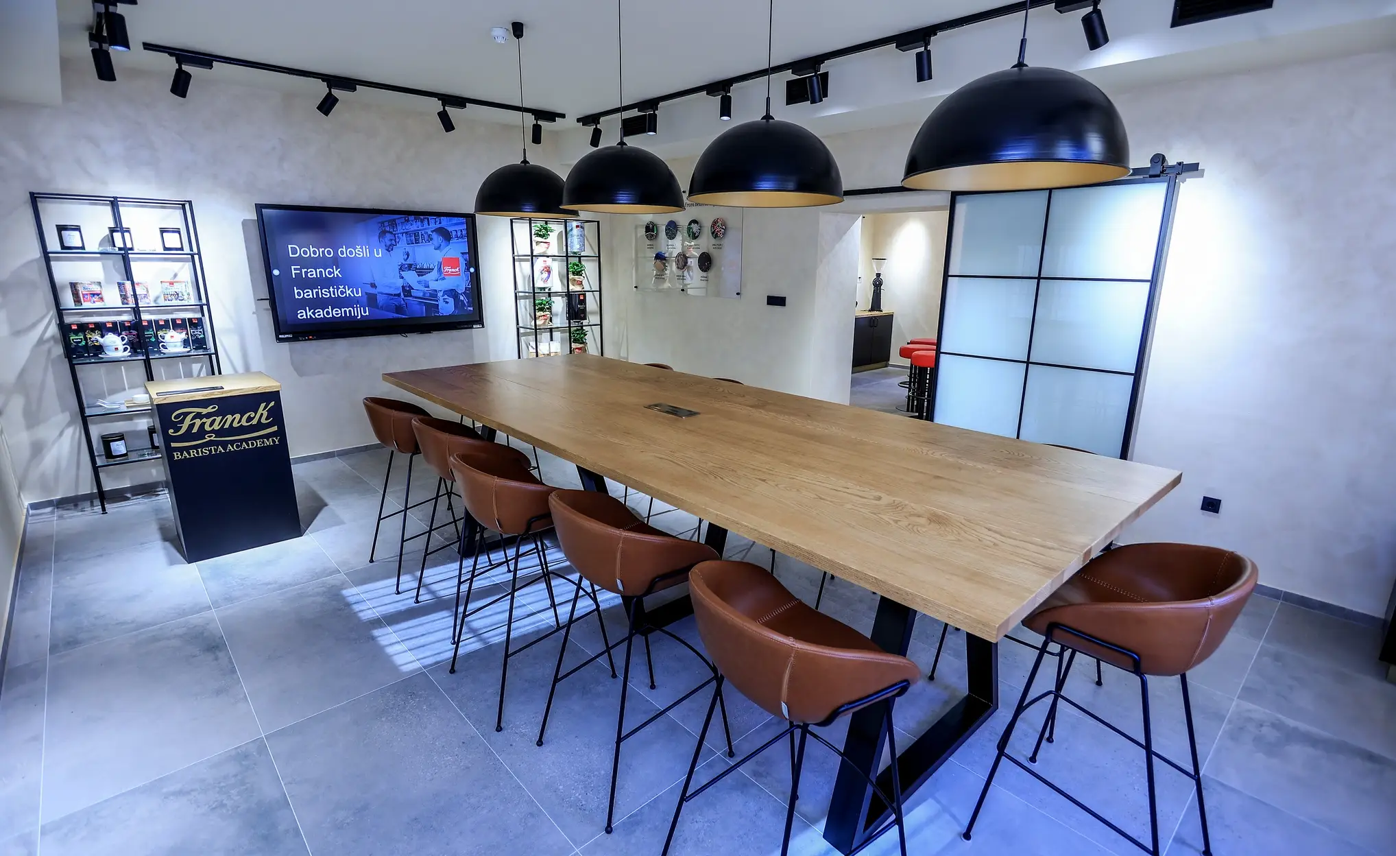 U povijesno zaštićenoj zgradi Francka u Vodovodnoj ulici u Zagrebu dizajnirali smo, proizveli i montirali novi iskorak kompanije u smjeru podizanja kvalitete pripreme toplih napitaka — prostor koji služi kao središte edukacije, inspiracije i izvrsnosti u svijetu toplih napitaka.