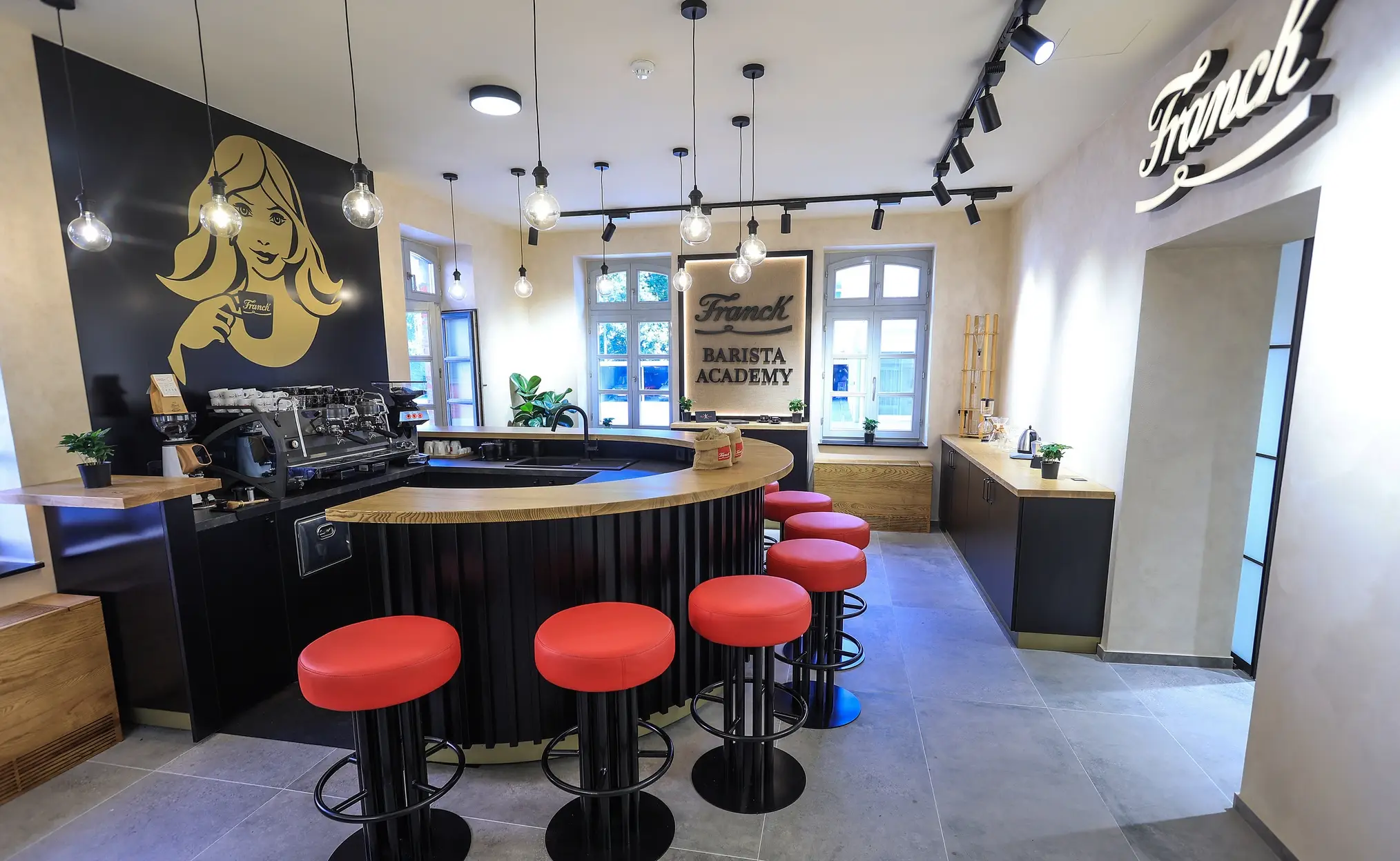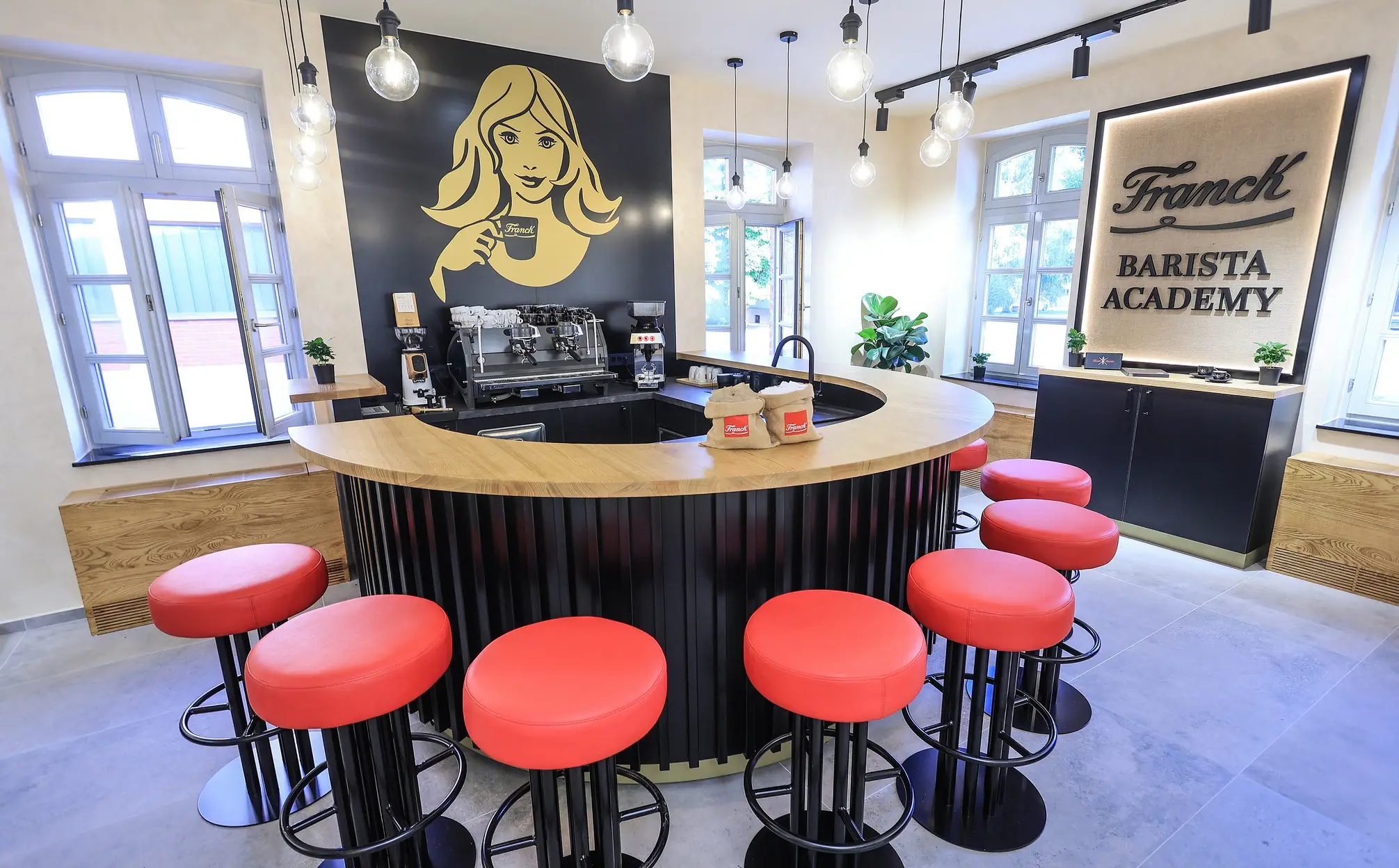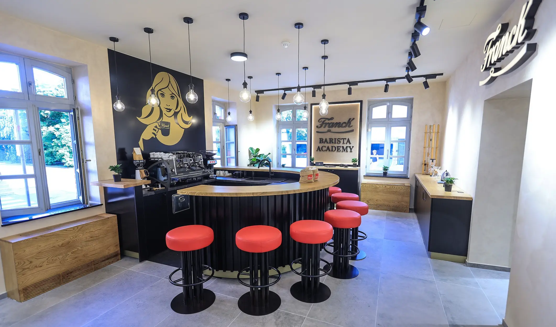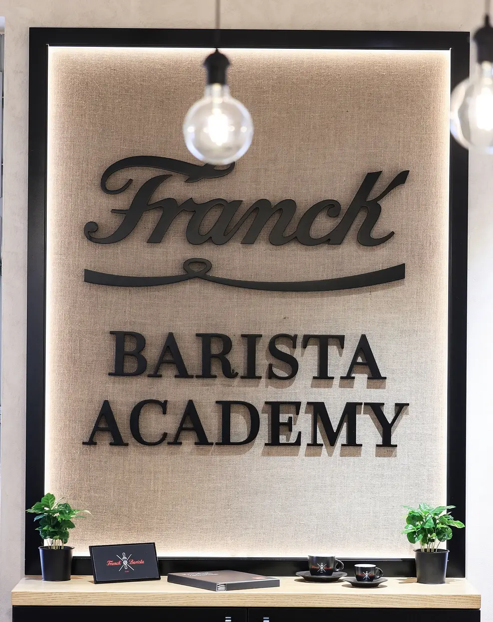 S ciljem promicanja kulture ispijanja kave i čaja te podizanja profesionalnih standarda ugostiteljstva, prostor smo u startu zamislili kao funkcionalan, moderan i otvoren, s naglaskom na edukaciju i neometanu komunikaciju polaznika s Franck baristima. Prostor je funkcionalno podijeljen u dvije cjeline – ulazni prostor kojim dominira polukružni šank opremljen najsuvremenijom profesionalnom opremom, dok je druga prostorija osmišljena kao edukacijska te se u njoj nalazi predimenzionirani barski stol s kružnim sjedenjem kao osnova prostorije, dodatno naglašen ručno izrađenim metalnim lusterima.