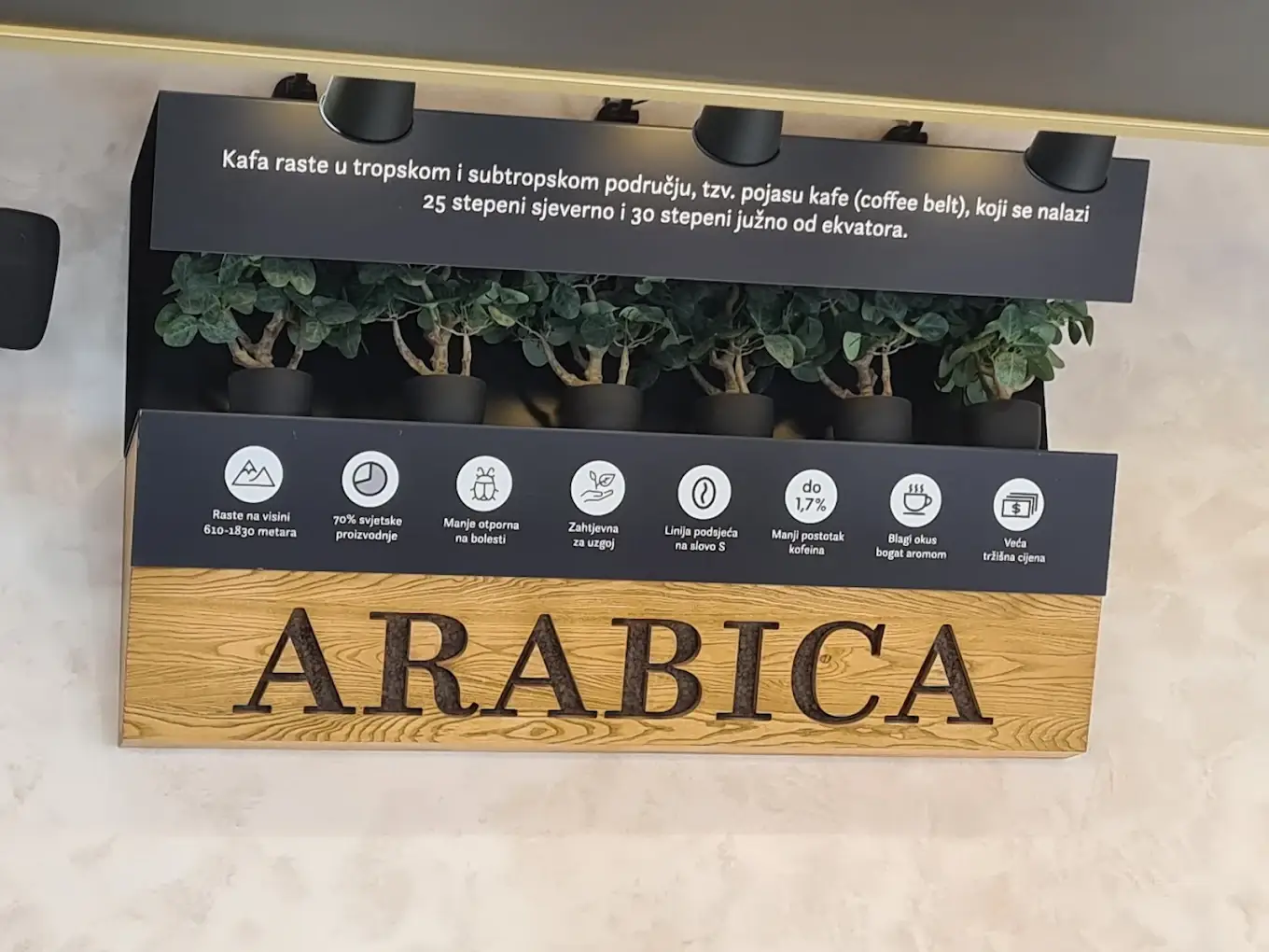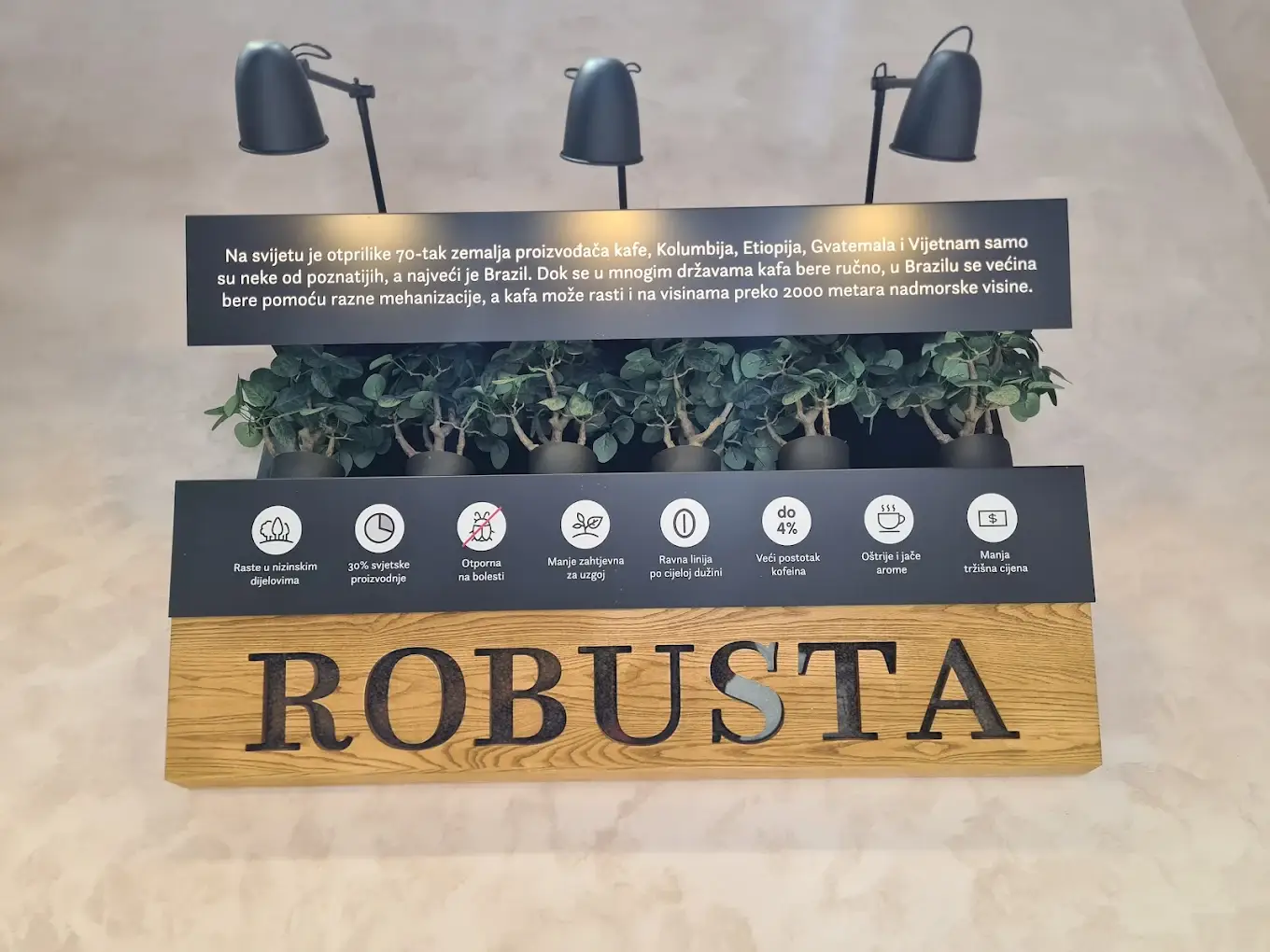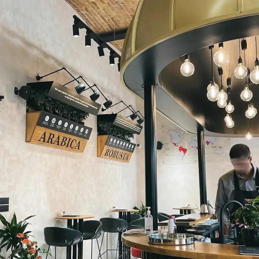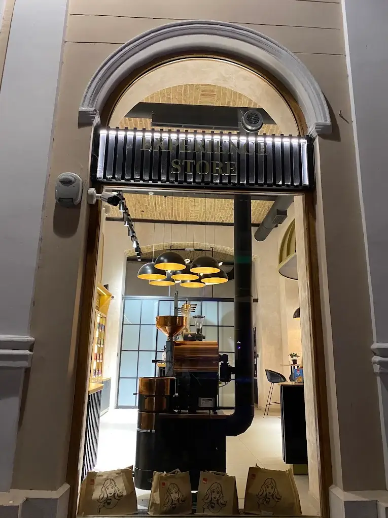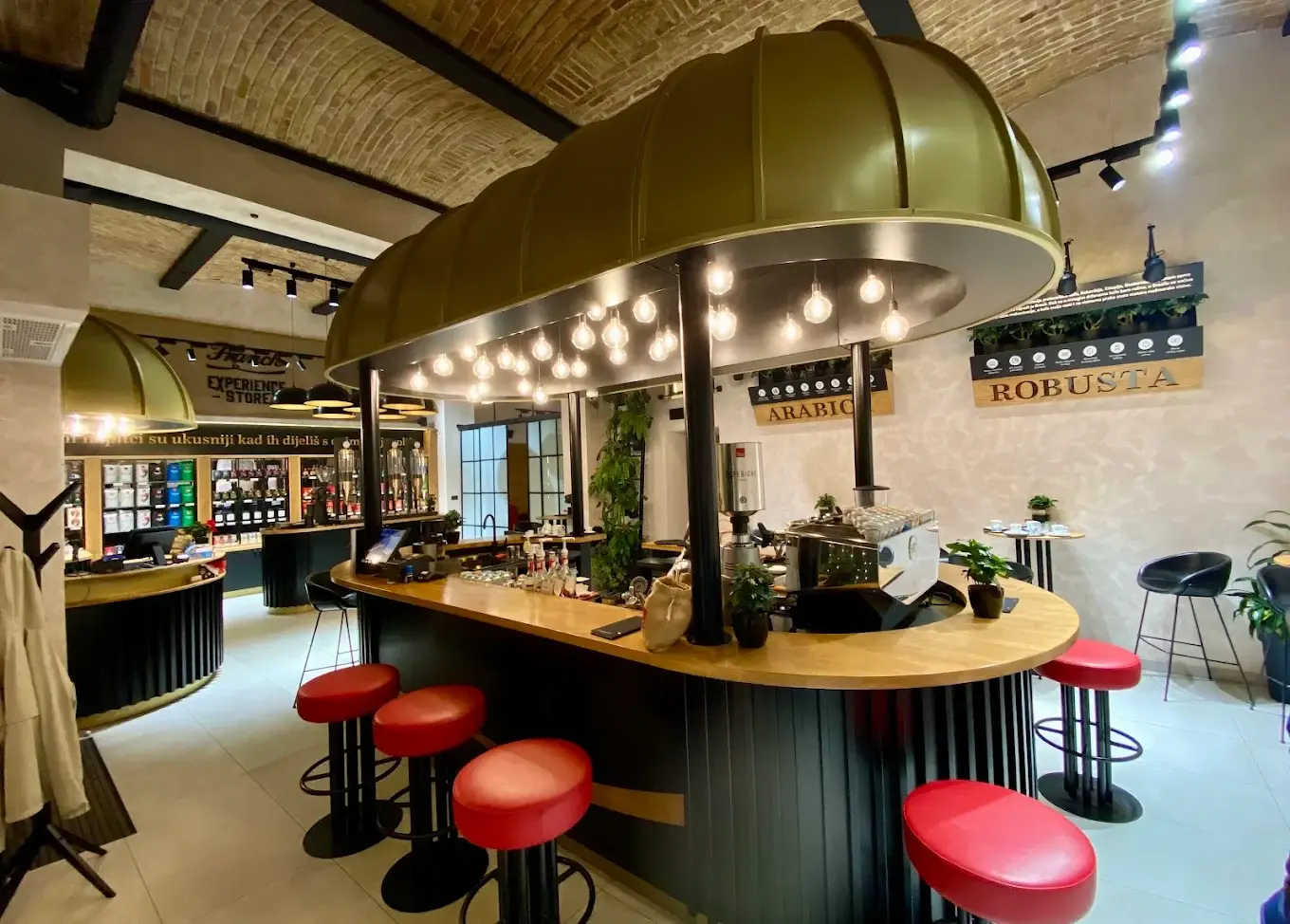 Dizajn je baziran na jednostavnim linijama uz korištenje prirodnih materijala poput masivnog drveta, željeza te mesinga. Tako prostorom dominira kupola nad šankom u boji mesinga koja definira cijeli ugostiteljski prostor, dok u maloprodajnom dijelu centralno mjesto zauzima otok na kojem se nalaze piloni sa svježom kavom. U pozadini otoka su maloprodajne police izvedene od punog drveta iznad kojih se nalazi komunikacijski topper obogaćen jutom te komunikacijom izvedenom u cijelosti od metala.