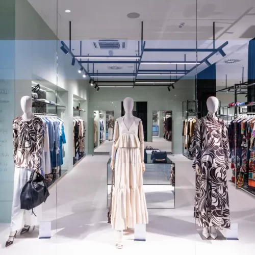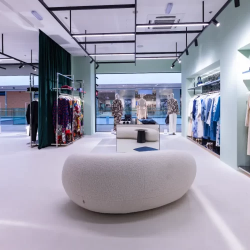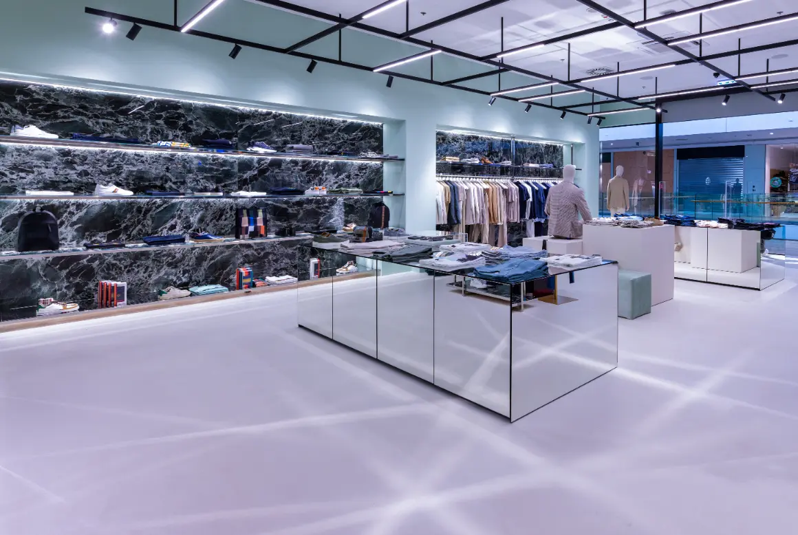 Dio centralnog namještaja koji je bio namijenjen za pozicioniranje lutki i modnih dodataka obradili smo istom tehnikom kao i pod tako da dobijemo efekt da izranjaju iz poda. Glavna prostorna rasvjeta je izveden kao stropni raster reflektora i linijskih rasvjetnih tijela, dok svaki element na kojem se izlaže odjeća ima skrivenu linijsku rasvjetu koja dodatno iluminira odjeću.