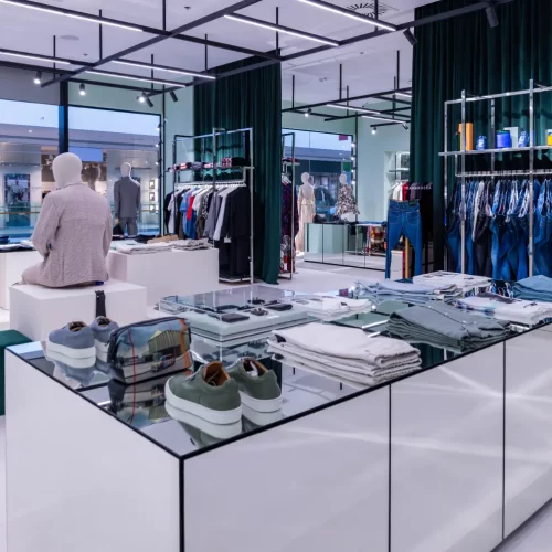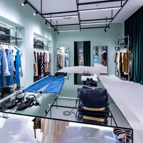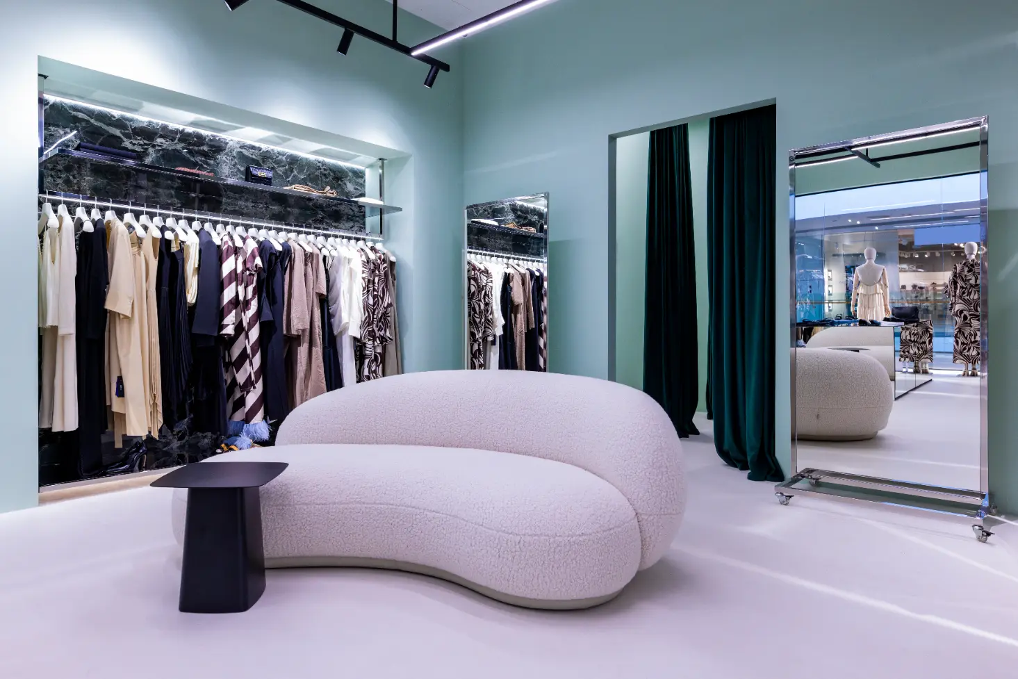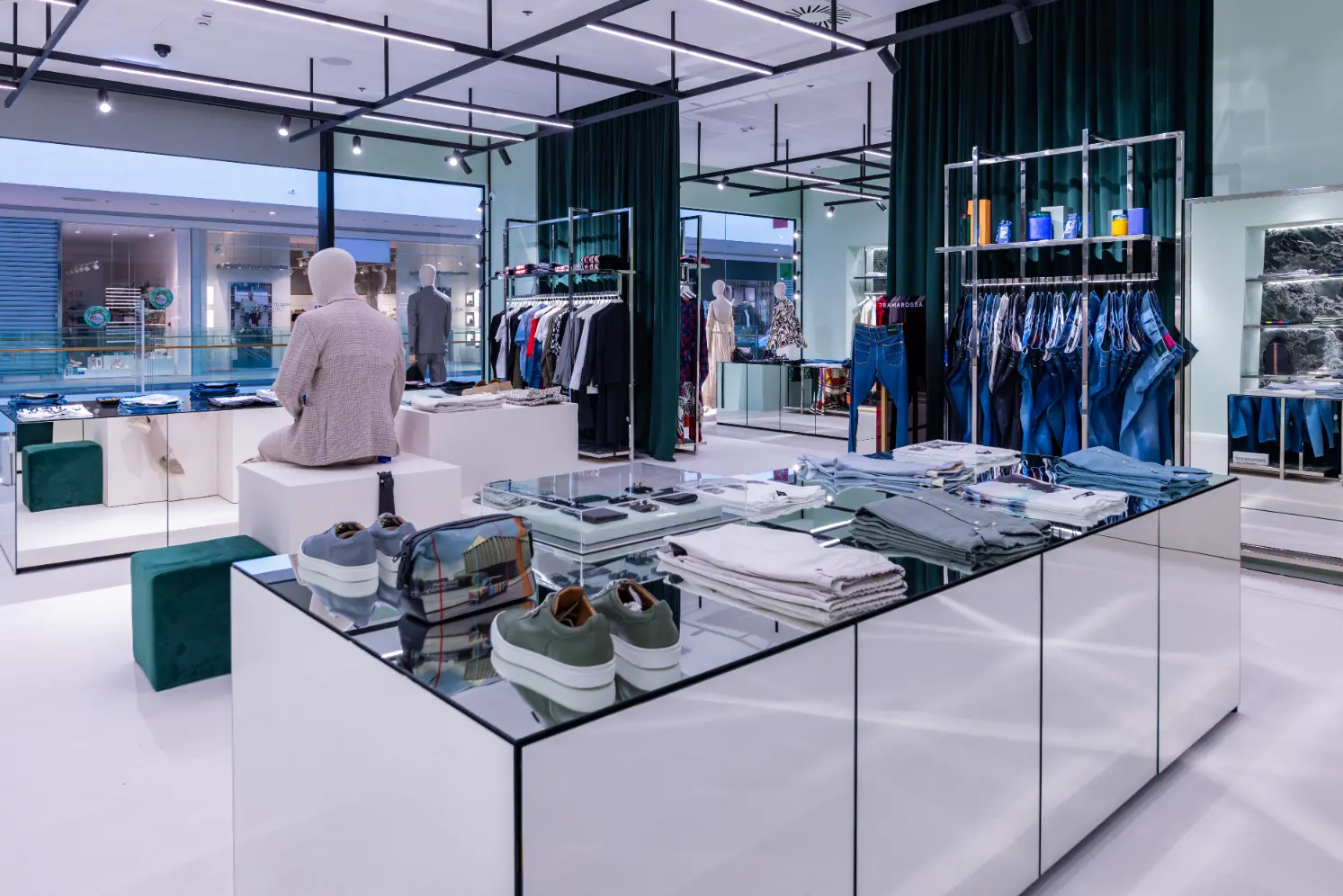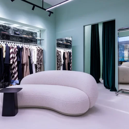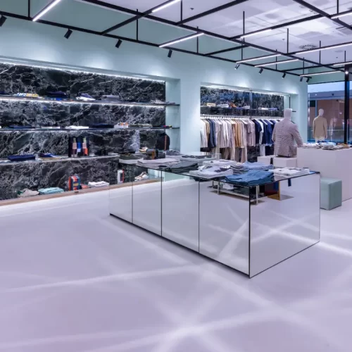 Dizajnu smo ovoga puta zato pristupili kao da dizajniramo odjeću – od materijala. Obzirom da smo htjeli postići nenametljivi luksuz, u izboru materijala za izradu custom namještaja na kojem će glavna zvijezda biti upravo artikli – odlučili smo se za nehrđajući čelik i ogledalo koji će radi svojih refleksija preuzimati boje artikala koji se na njima budu nalazili. Linije namještaja smo držali vrlo strogima, dok je fokus u izradi bio postizanje savršenih spojeva kako bi svaki komad djelovao saliveno. Kod izbora poda odlučili smo se za lijevani pod svijetle bež boje, dok su nam zidovi i predimenzionirani zastori dali karakterni izgled svojim zelenim tonovima. Statement materijal – zeleni kamen – koristili smo kao pozadinu u izbama koje smo izveli u gips-kartonskim pločama.
