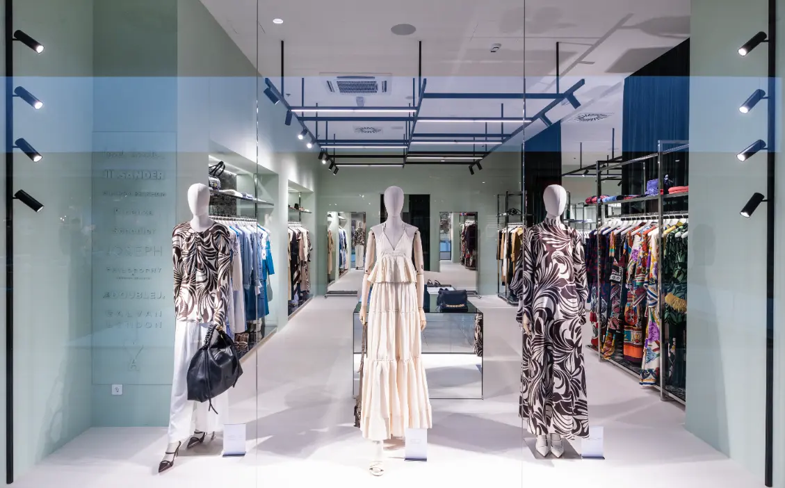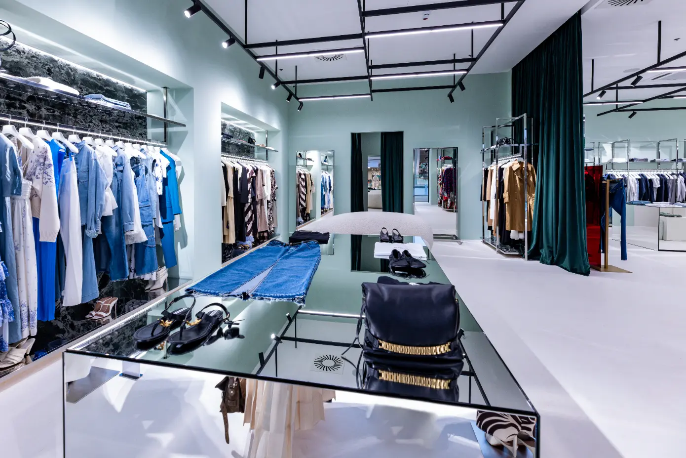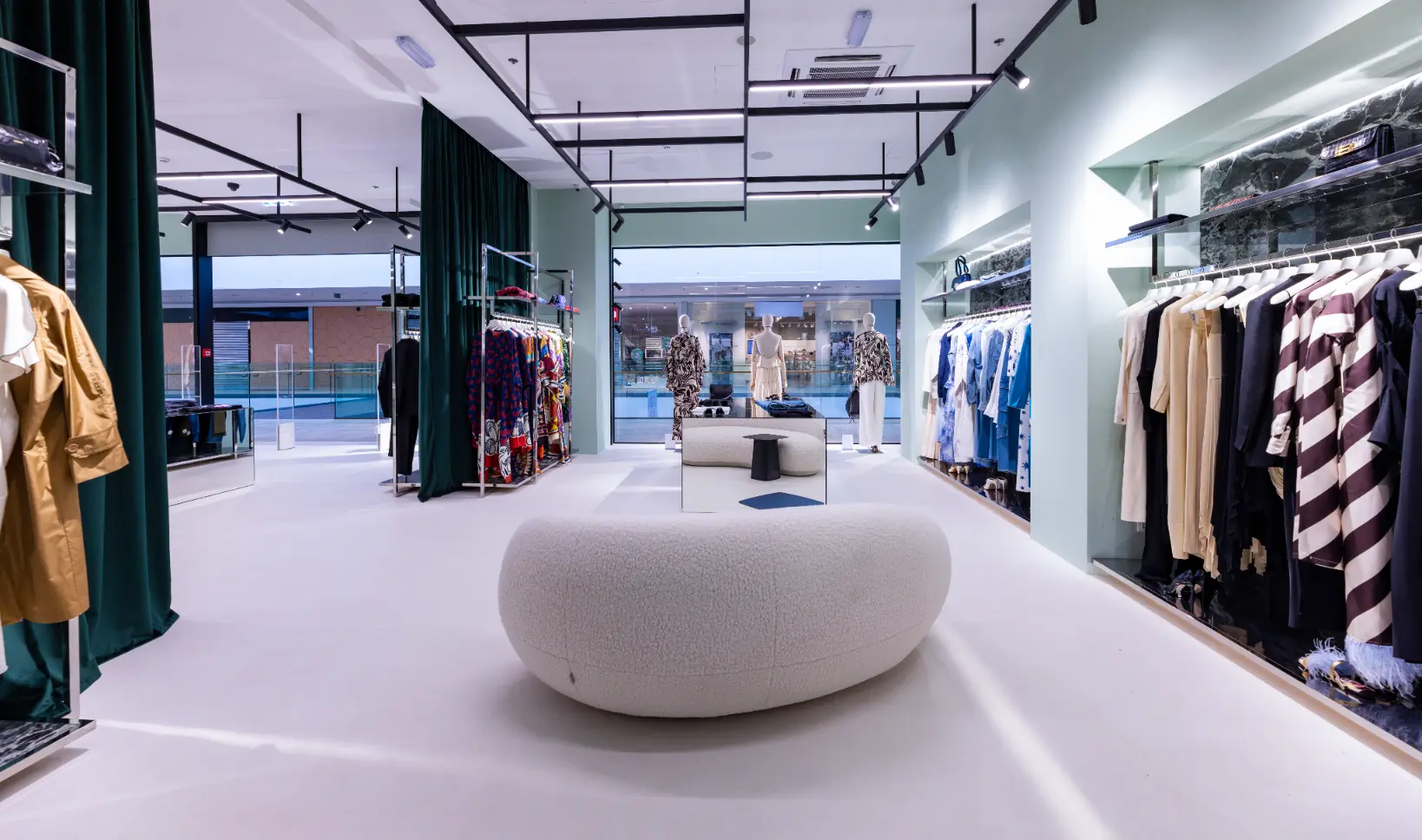 Dizajnu smo ovoga puta zato pristupili kao da dizajniramo odjeću – od materijala. Obzirom da smo htjeli postići nenametljivi luksuz, u izboru materijala za izradu custom namještaja na kojem će glavna zvijezda biti upravo artikli – odlučili smo se za nehrđajući čelik i ogledalo koji će radi svojih refleksija preuzimati boje artikala koji se na njima budu nalazili. Linije namještaja smo držali vrlo strogima, dok je fokus u izradi bio postizanje savršenih spojeva kako bi svaki komad djelovao saliveno. Kod izbora poda odlučili smo se za lijevani pod svijetle bež boje, dok su nam zidovi i predimenzionirani zastori dali karakterni izgled svojim zelenim tonovima. Statement materijal – zeleni kamen – koristili smo kao pozadinu u izbama koje smo izveli u gips-kartonskim pločama.