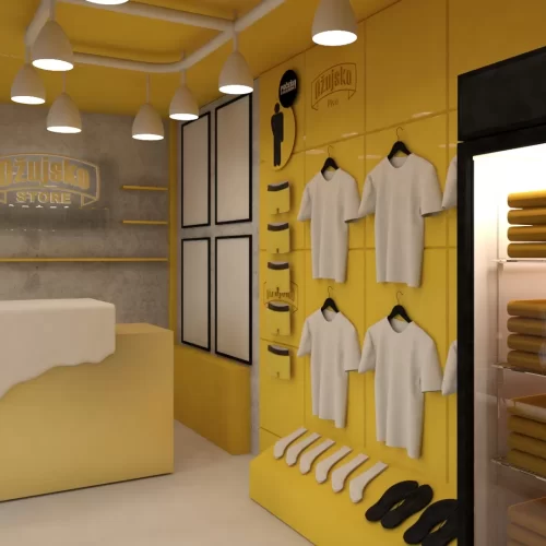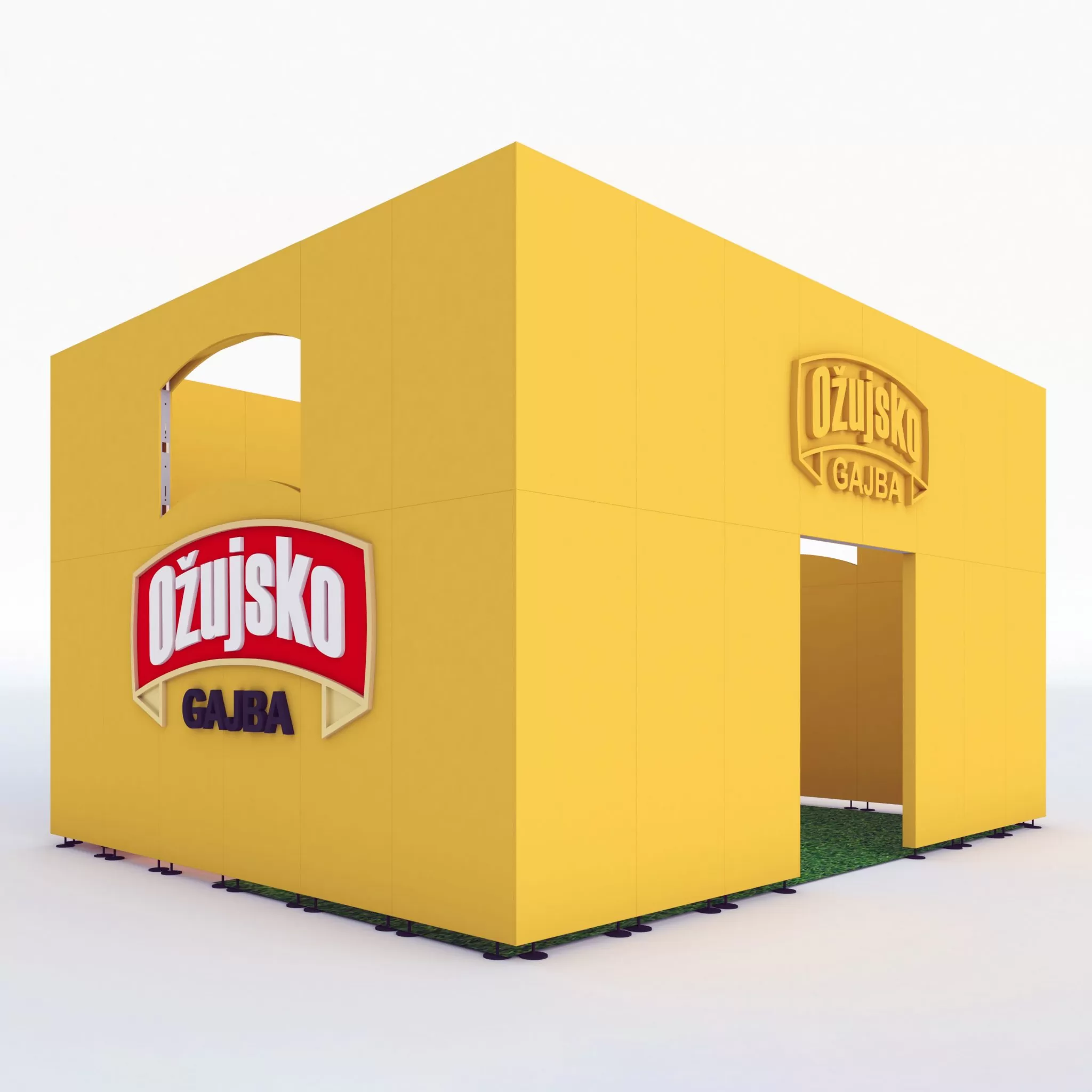 Gajba je izvedena kao ljuska oko custom-made prijenosnog kontejnera kojeg smo u cijelosti sami dizajnirali, projektirali i izradili te uredili interijer tako da prati identitet brenda i istovremeno osigura maloprodajnu funkcionalnost. Fronta kontejnera izrađena je od izo stakla s centralno postavljenim ulaznim vratima, dok je interijer u cijelosti zatvoren u dekorativne obloge kojima dominiraju betonski siva i Žujina RAL žuta boja. Predprostor uređen je kao welcome zona u koju je smješten kutak s kratkom povijesti Zagrebačke pivovare, dok su na drugu stranu predprostora postavljeni hladnjaci i barski stolci za sve žedne goste dućana.