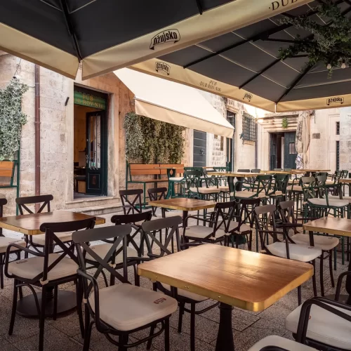 Na prostoru vanjske terase koja je ujedno i žila kucavica samog objekta, iskorišteni su sve pozicije tako da su vanjski zidovi objekta postali community barske klupe dok na samom trgu imamo stilizirane stolice uz stolove izvedene od masivnog drveta.
