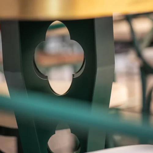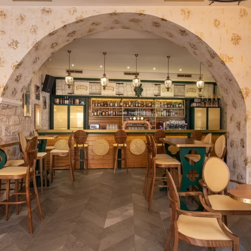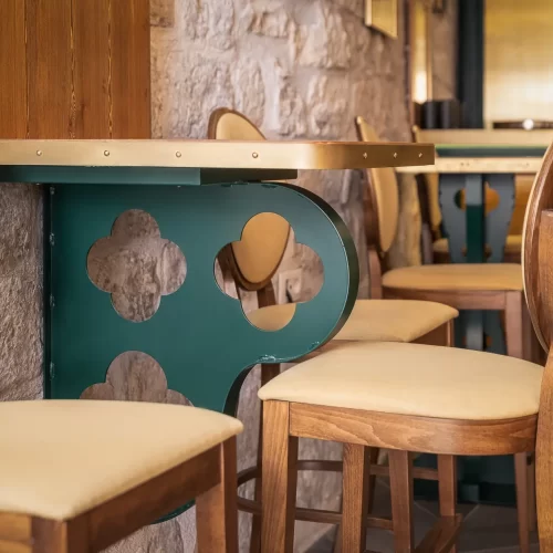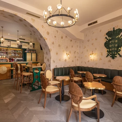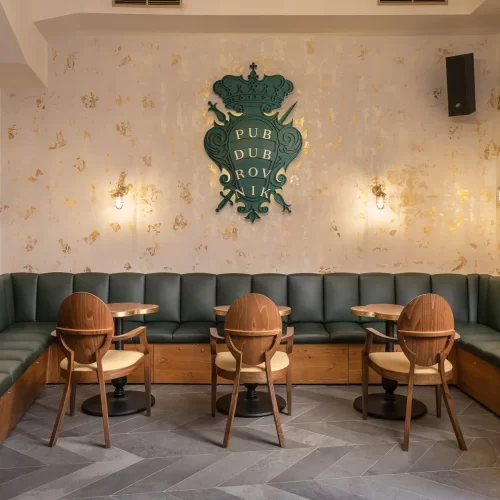 Dizajn je baziran na grbu grada Dubrovnika te prepoznatljivoj dubrovačkoj zelenoj boji s puno zlatnih detalja te detalja od pravog kamena. Kao element u dizajnu stolova koristili smo poznatu dubrovačku djetelinu koja se nalazi na ulaznim mostovima u grad, dok su stolice pomno izabrane kako bi istovremeno djelovale opušteno i udobno, ali i luksuzno.