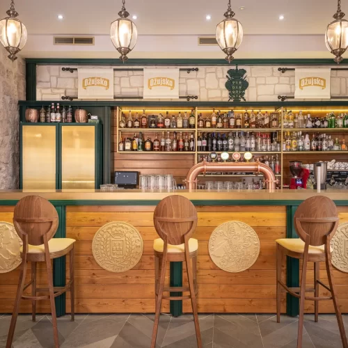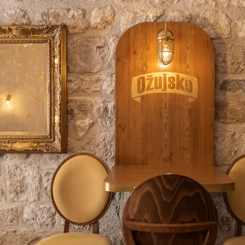 U povijesnoj jezgri grada Dubrovnika imali smo priliku stvoriti prvi Ožujsko flagship pub. Kako je prostor kvadraturom dosta ograničen, a pripada mu velika vanjska terasa, zahtijevao je pomno prostorno optimiziranje. Šank smo stoga smjestili u stražnji dio objekta kako bi imao dovoljno kapaciteta za rad s velikim brojem stolova vanjske terase. U prednjem dijelu objekta smješteno je nisko sjedenje dok je koridor do šanka iskorišten za konzolne barske stolove i stolice kako bismo povećali unutarnji broj sjedećih mjesta bez stvaranja osjećaja prenatrpanosti prostora.