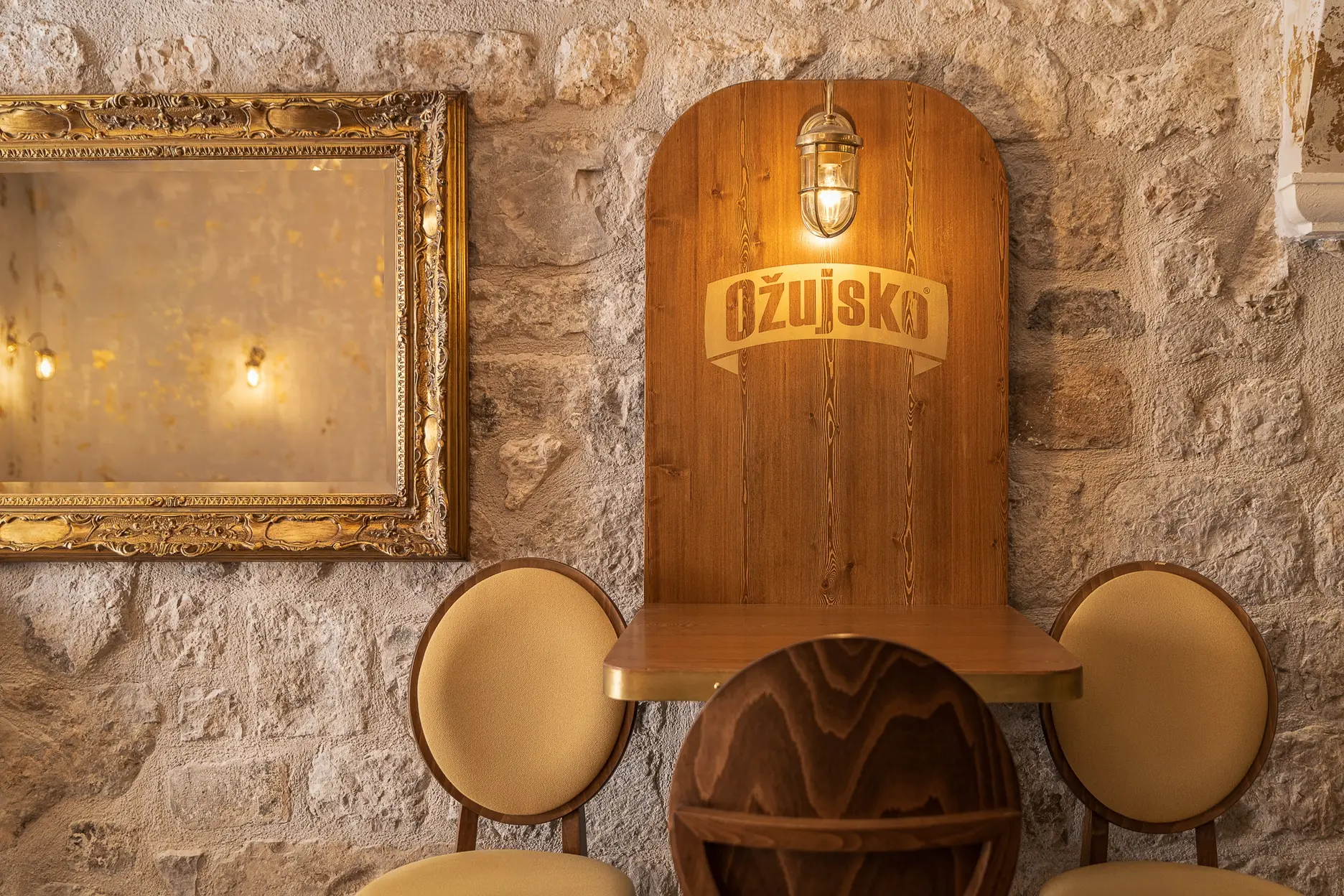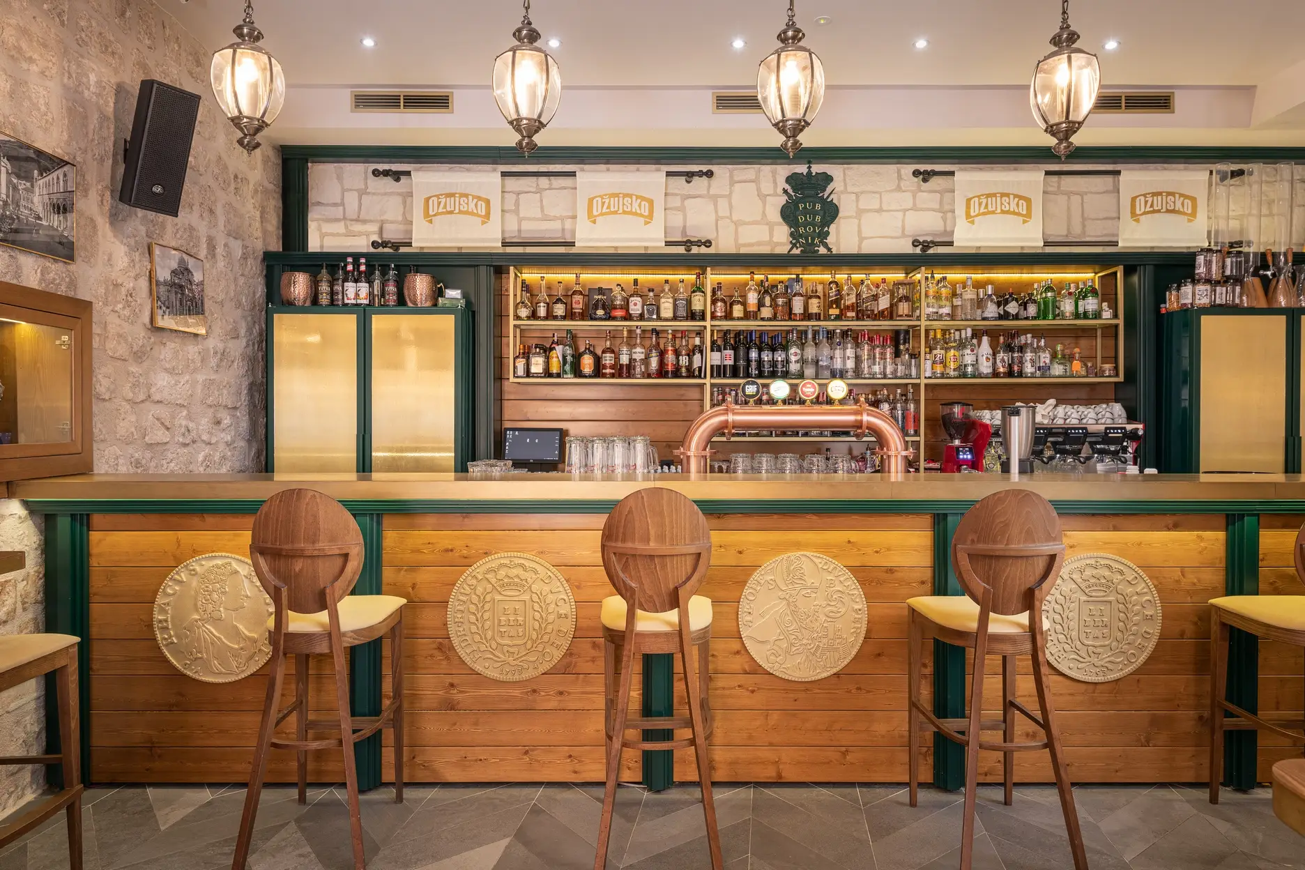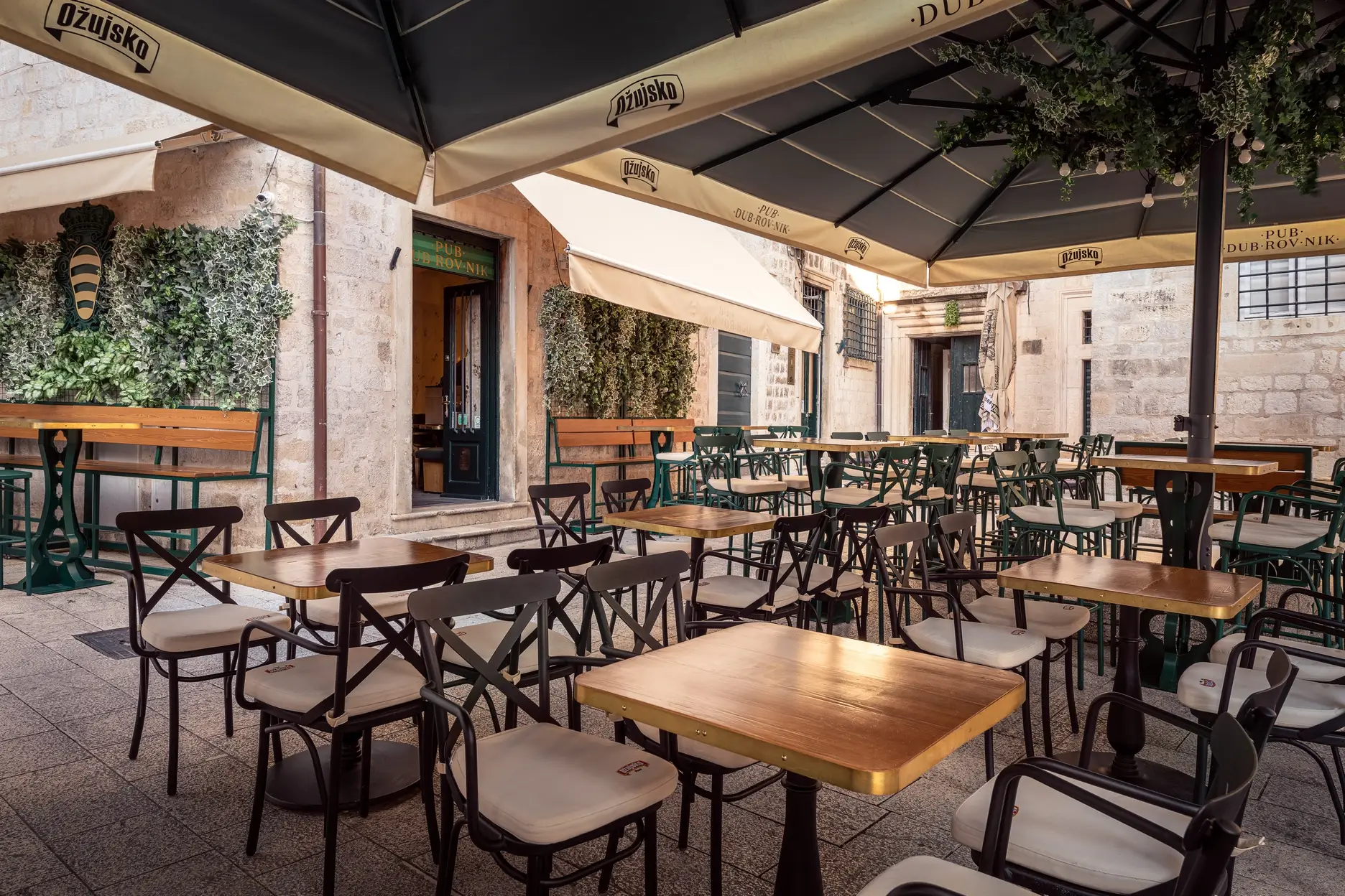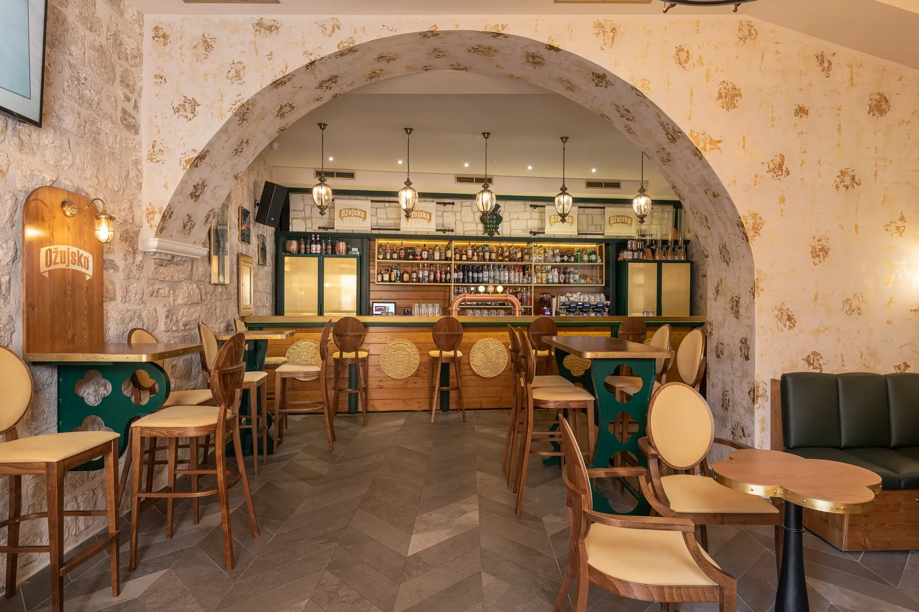 U povijesnoj jezgri grada Dubrovnika imali smo priliku stvoriti prvi Ožujsko flagship pub. Kako je prostor kvadraturom dosta ograničen, a pripada mu velika vanjska terasa, zahtijevao je pomno prostorno optimiziranje. Šank smo stoga smjestili u stražnji dio objekta kako bi imao dovoljno kapaciteta za rad s velikim brojem stolova vanjske terase. U prednjem dijelu objekta smješteno je nisko sjedenje dok je koridor do šanka iskorišten za konzolne barske stolove i stolice kako bismo povećali unutarnji broj sjedećih mjesta bez stvaranja osjećaja prenatrpanosti prostora.