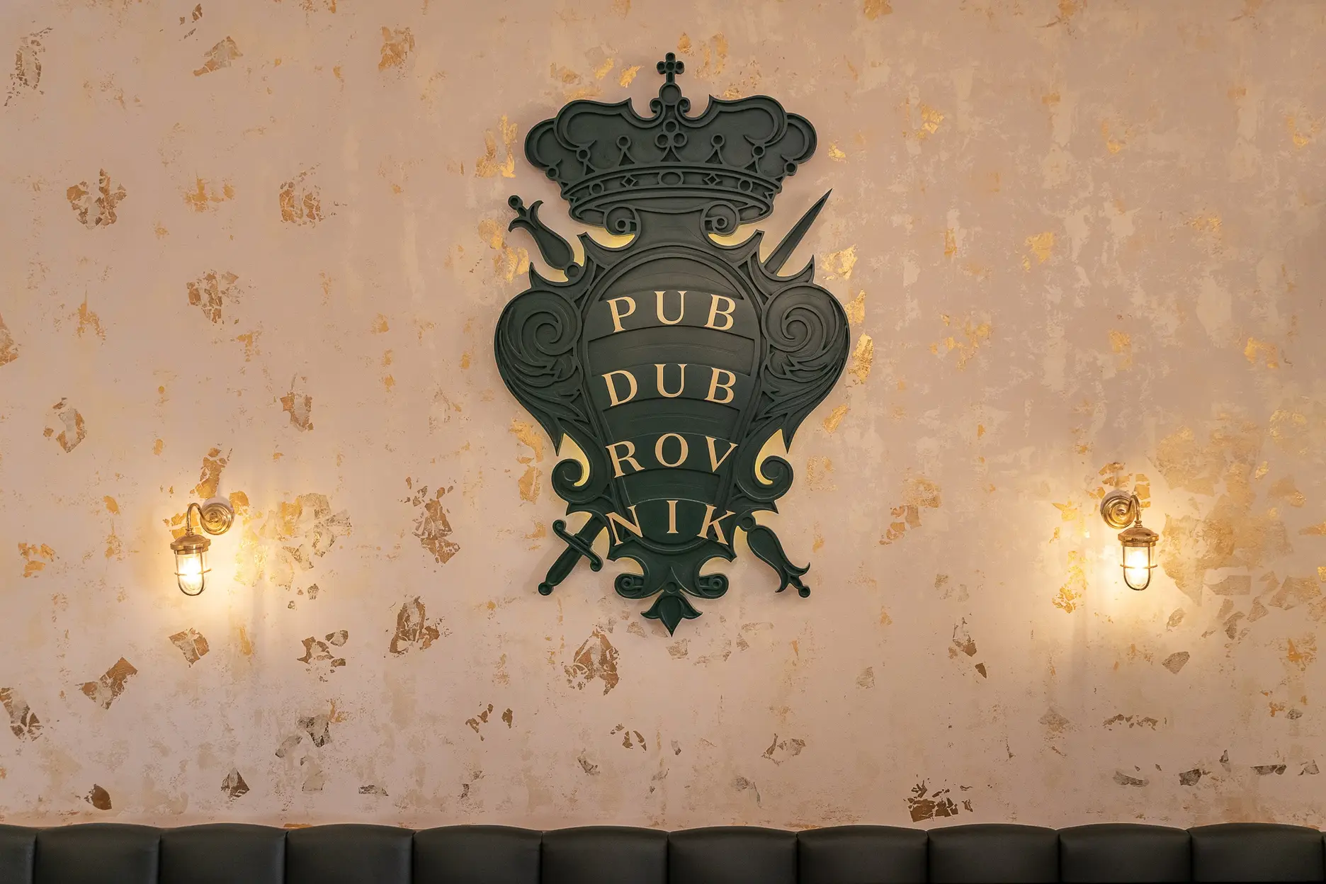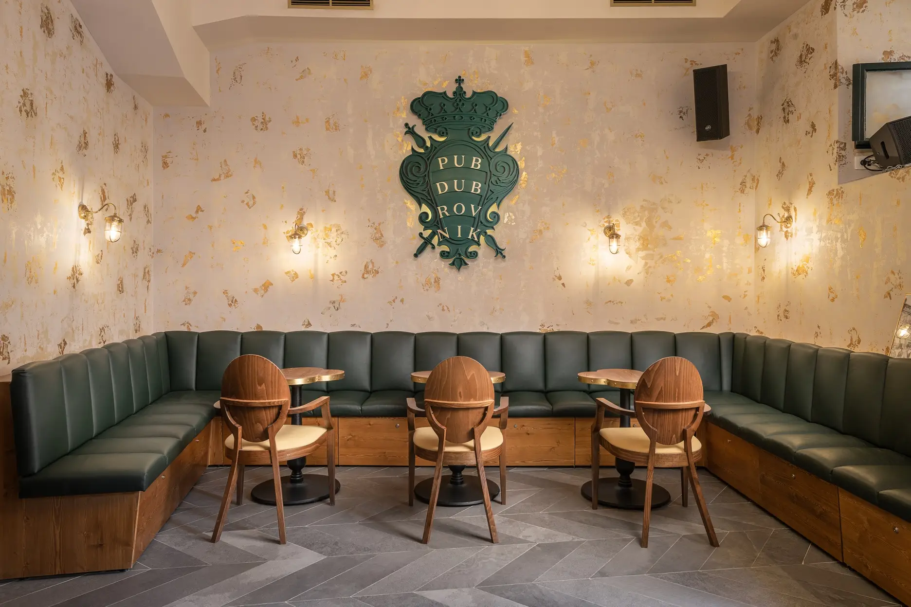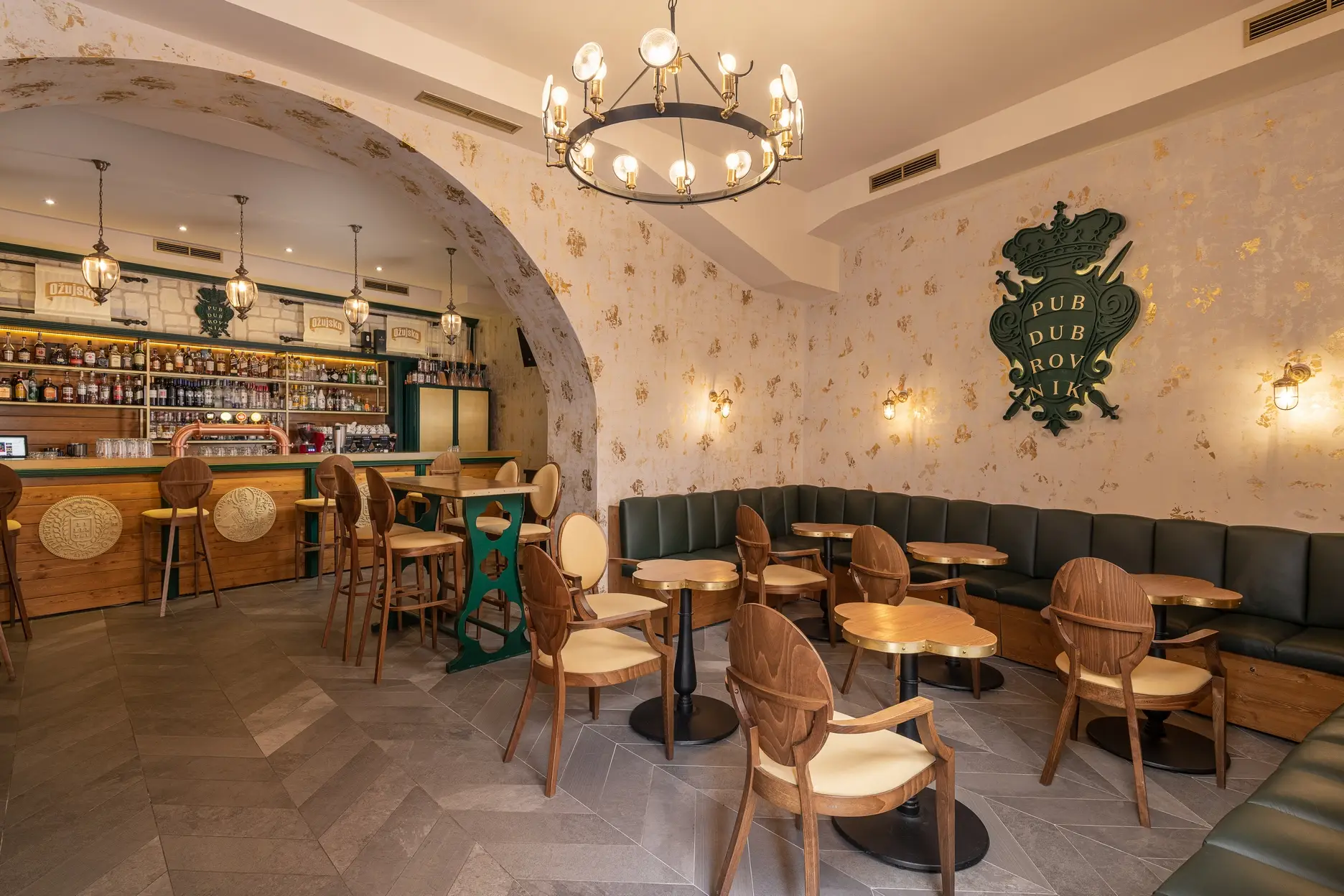 Dizajn je baziran na grbu grada Dubrovnika te prepoznatljivoj dubrovačkoj zelenoj boji s puno zlatnih detalja te detalja od pravog kamena. Kao element u dizajnu stolova koristili smo poznatu dubrovačku djetelinu koja se nalazi na ulaznim mostovima u grad, dok su stolice pomno izabrane kako bi istovremeno djelovale opušteno i udobno, ali i luksuzno.