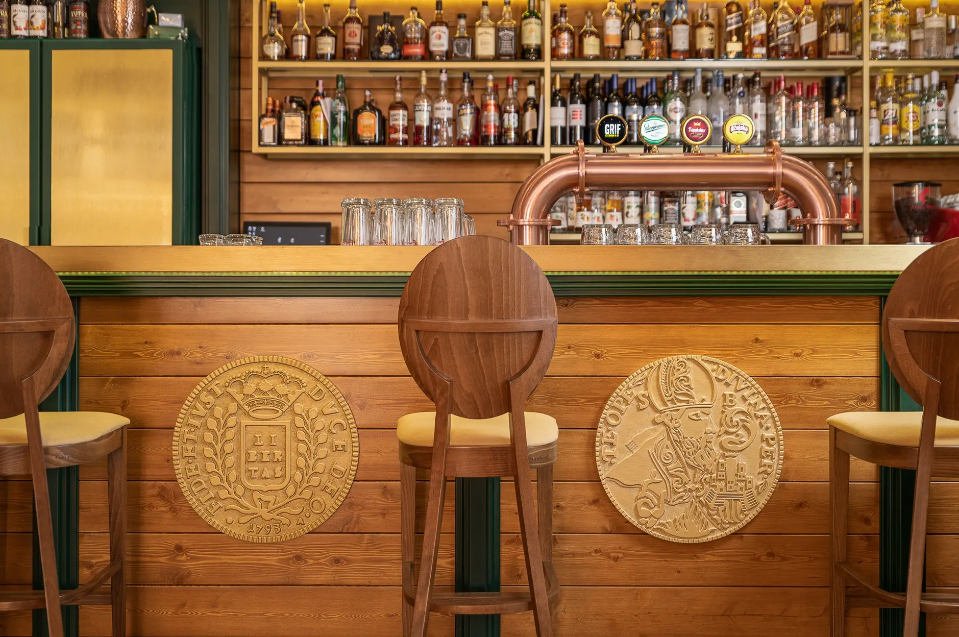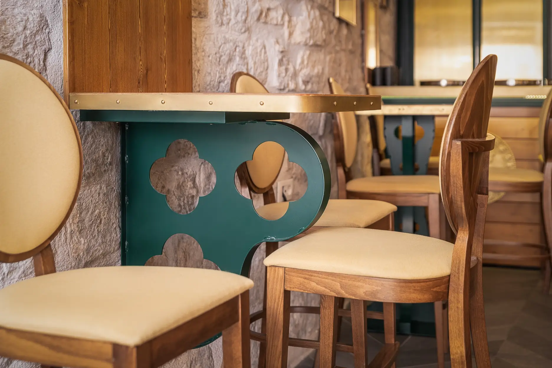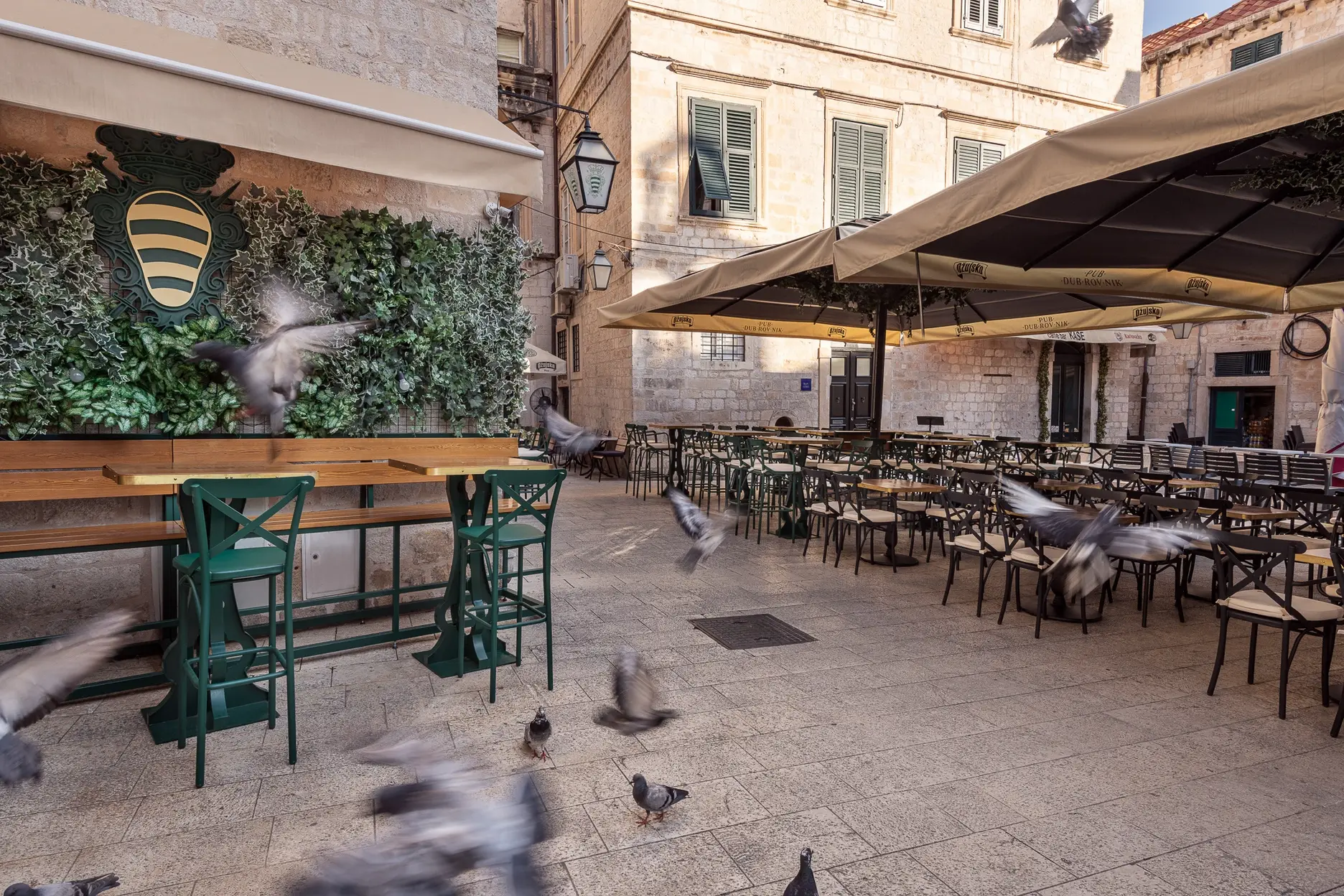Dizajn je baziran na grbu grada Dubrovnika te prepoznatljivoj dubrovačkoj zelenoj boji s puno zlatnih detalja te detalja od pravog kamena. Kao element u dizajnu stolova koristili smo poznatu dubrovačku djetelinu koja se nalazi na ulaznim mostovima u grad, dok su stolice pomno izabrane kako bi istovremeno djelovale opušteno i udobno, ali i luksuzno.