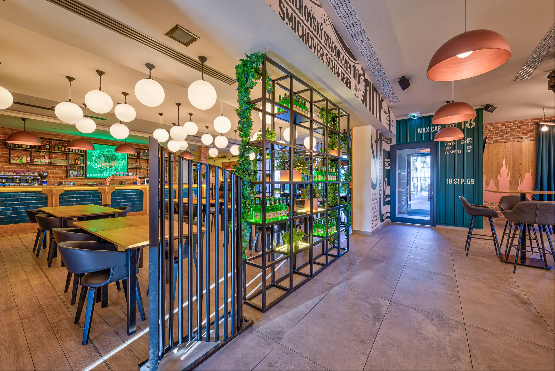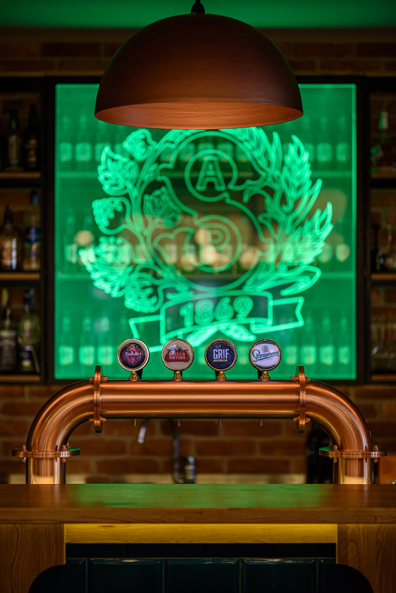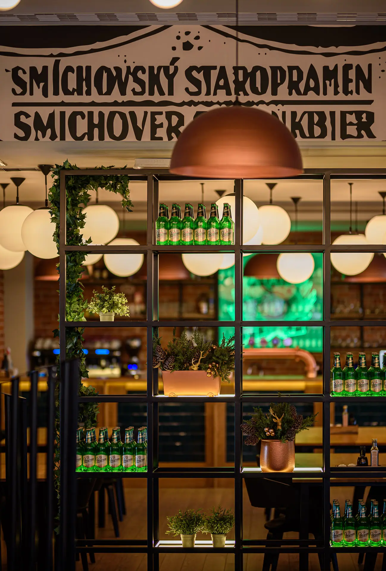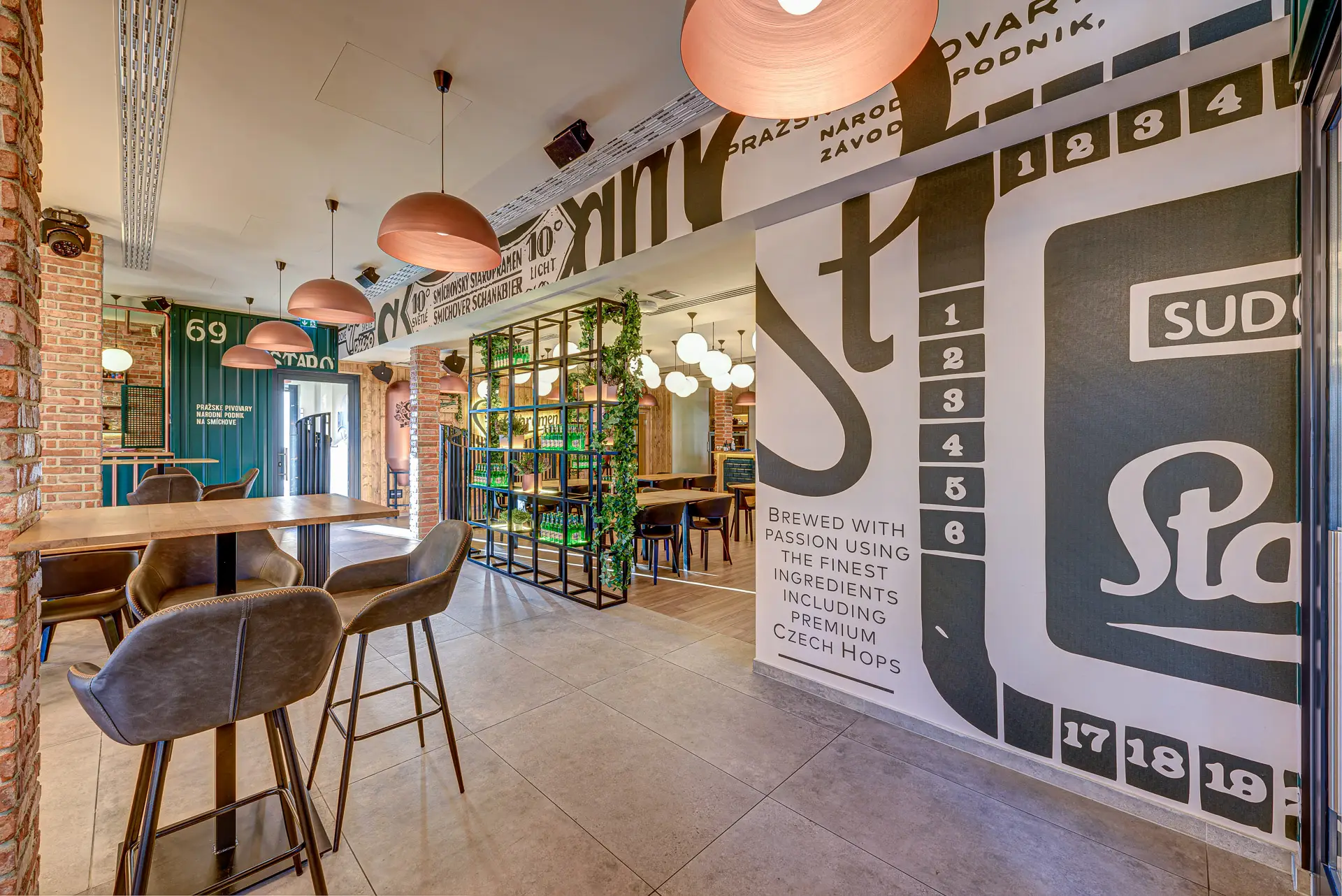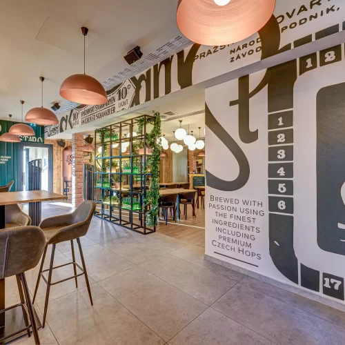 Cjelokupan interijer inspiriran je brendom Staropramen, što smo postigli kombinacijom materijala, nosećom zelenom bojom i detaljima poput procesa proizvodnje piva i bakrenih kontura Praga.