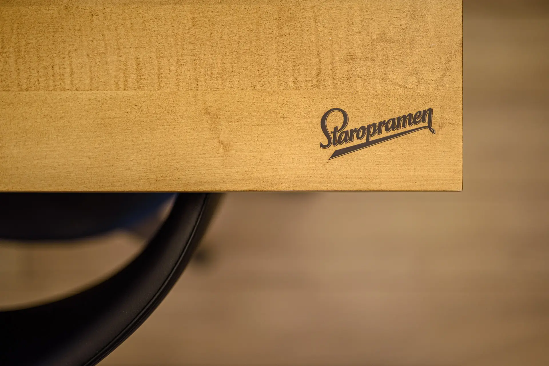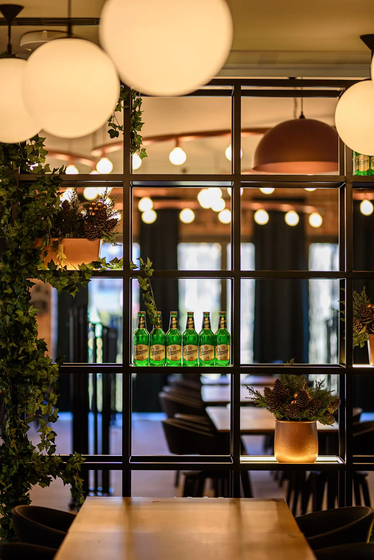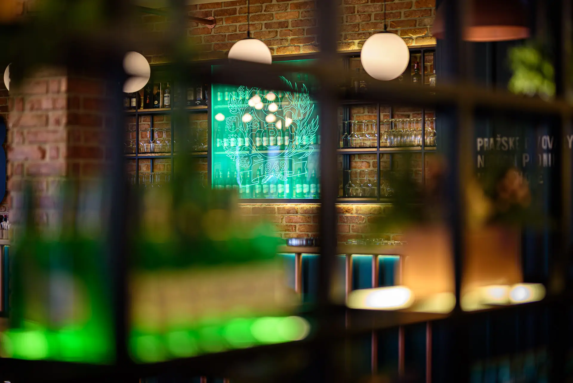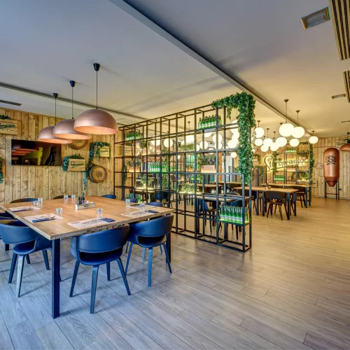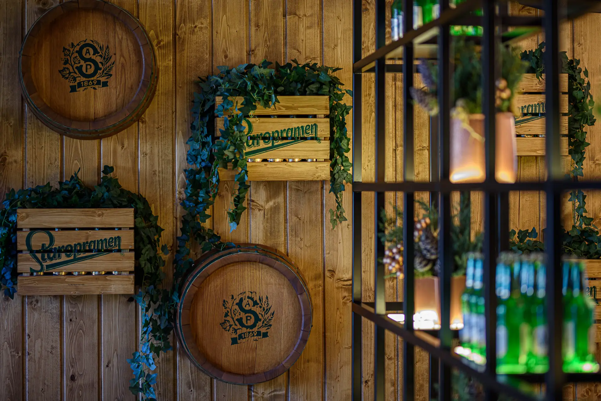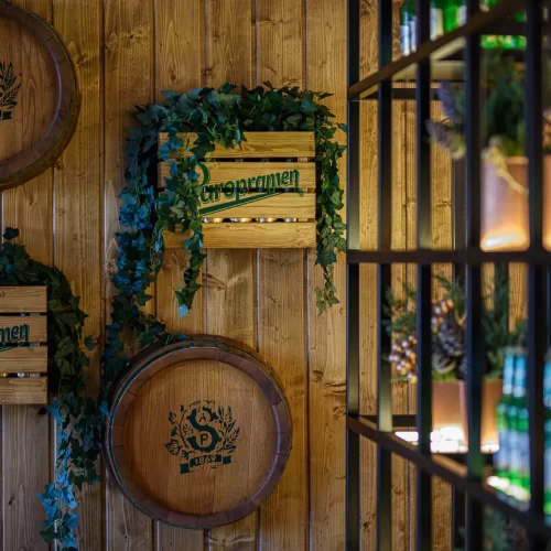 Cjelokupan interijer inspiriran je brendom Staropramen, što smo postigli kombinacijom materijala, nosećom zelenom bojom i detaljima poput procesa proizvodnje piva i bakrenih kontura Praga.