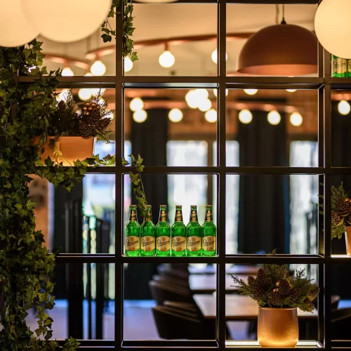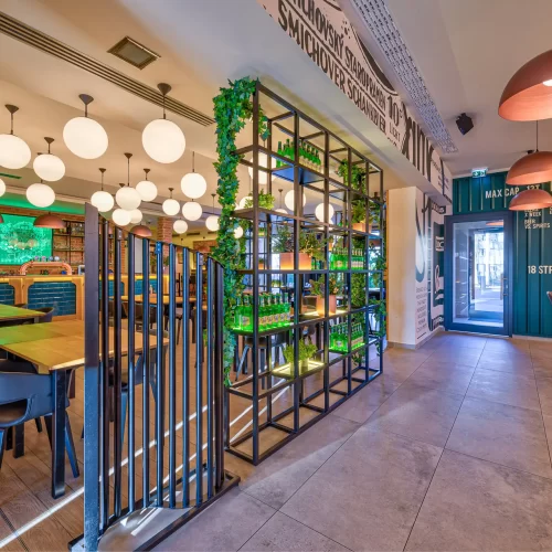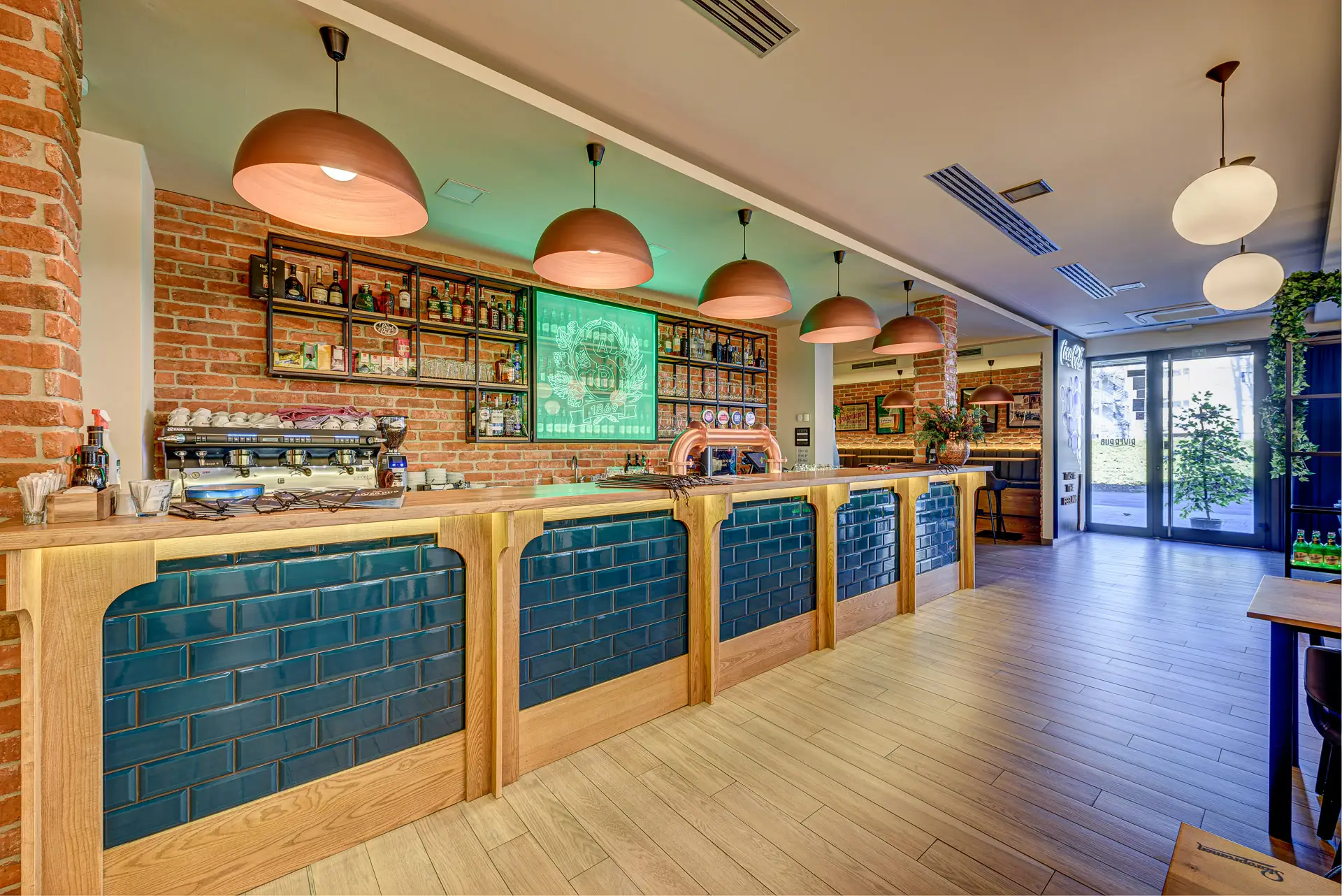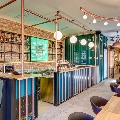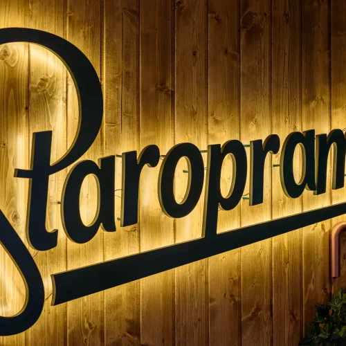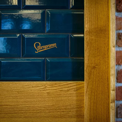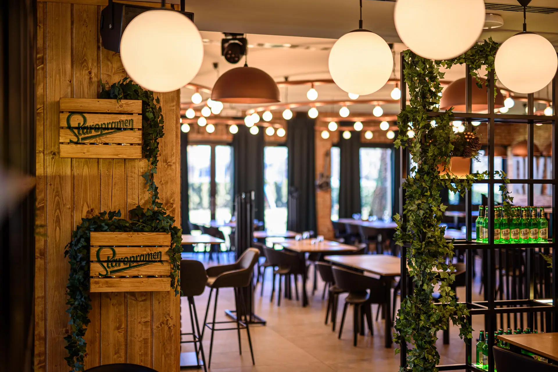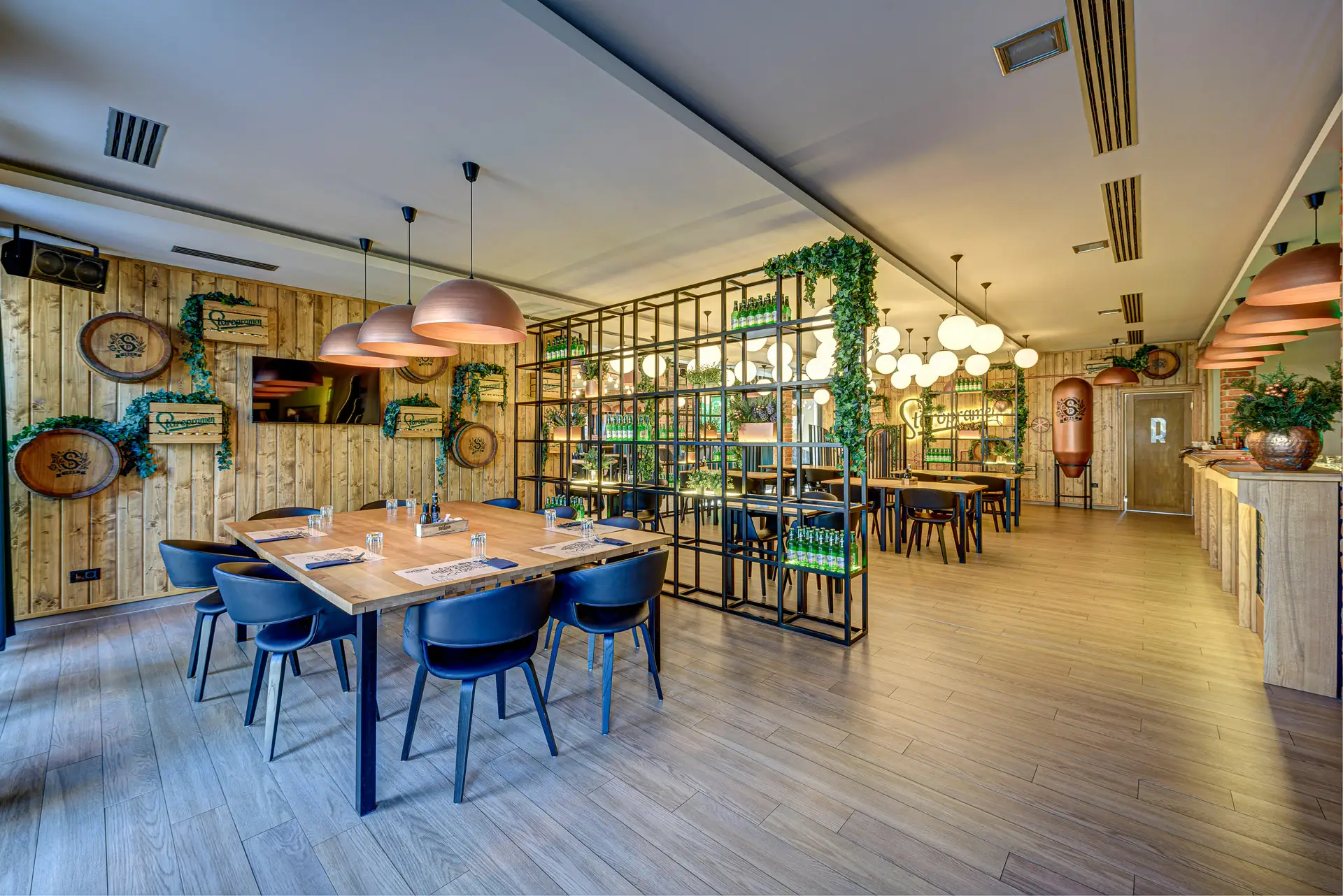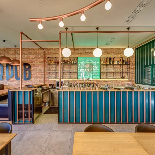 Cjelokupan interijer inspiriran je brendom Staropramen, što smo postigli kombinacijom materijala, nosećom zelenom bojom i detaljima poput procesa proizvodnje piva i bakrenih kontura Praga.