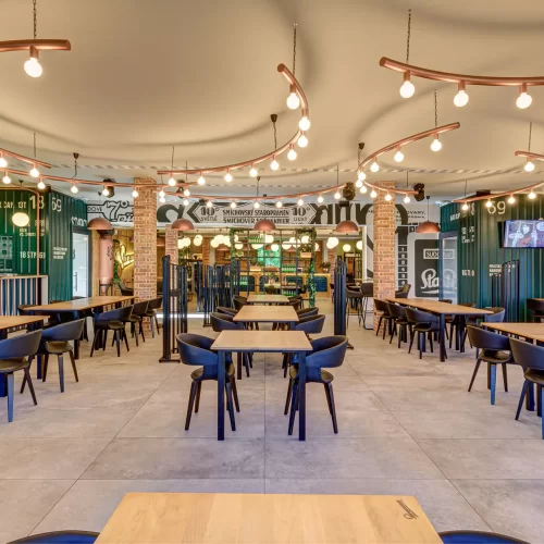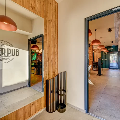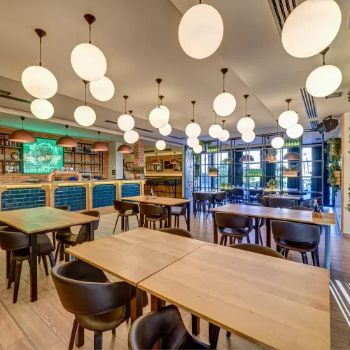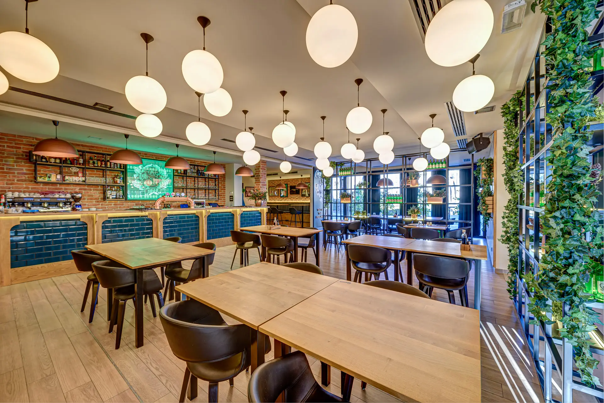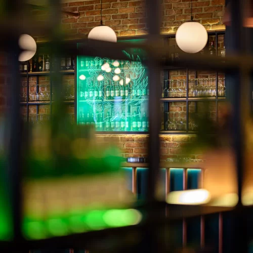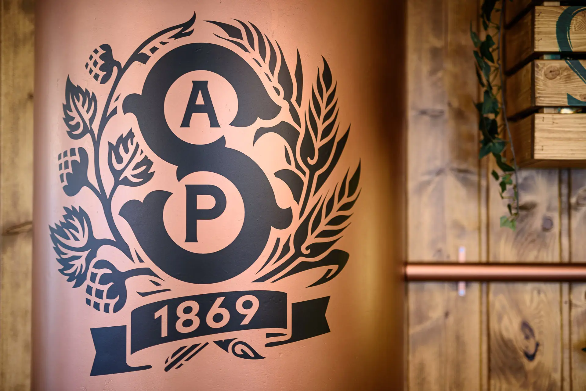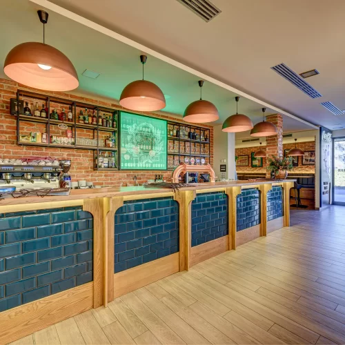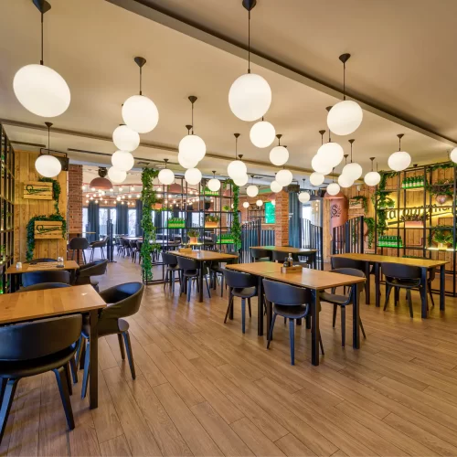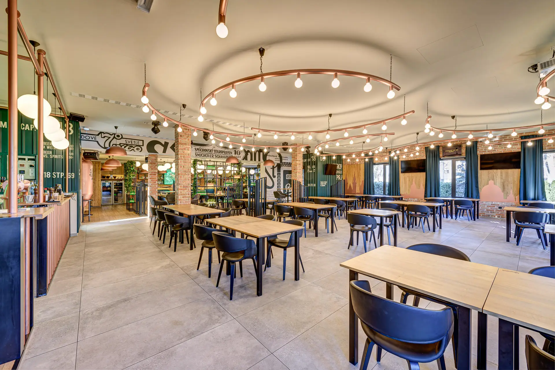 Cjelokupan interijer inspiriran je brendom Staropramen, što smo postigli kombinacijom materijala, nosećom zelenom bojom i detaljima poput procesa proizvodnje piva i bakrenih kontura Praga.