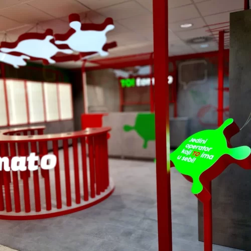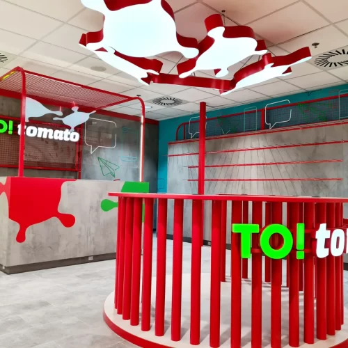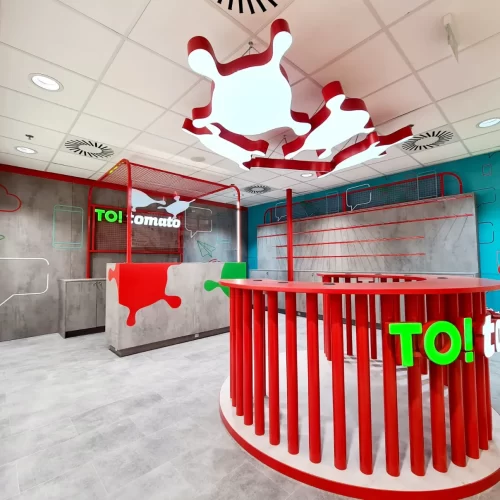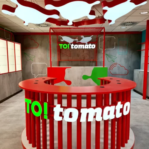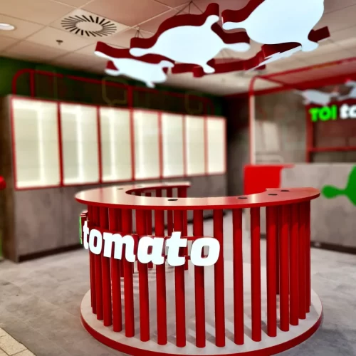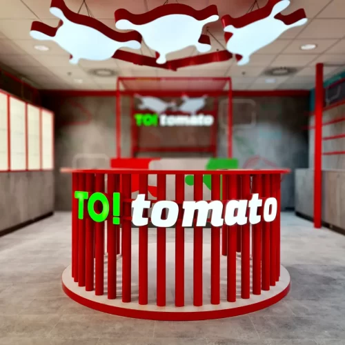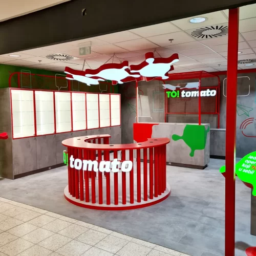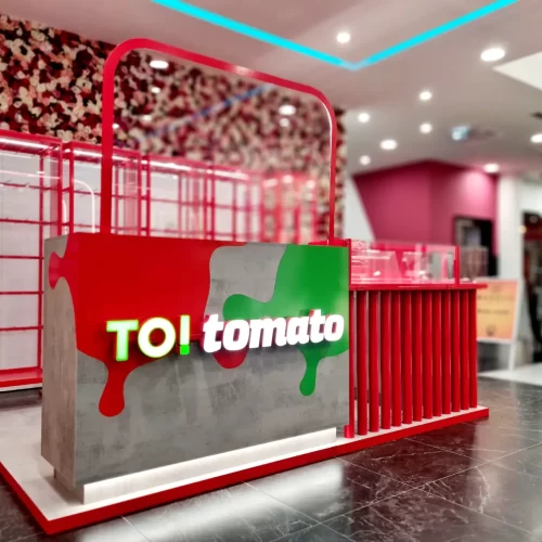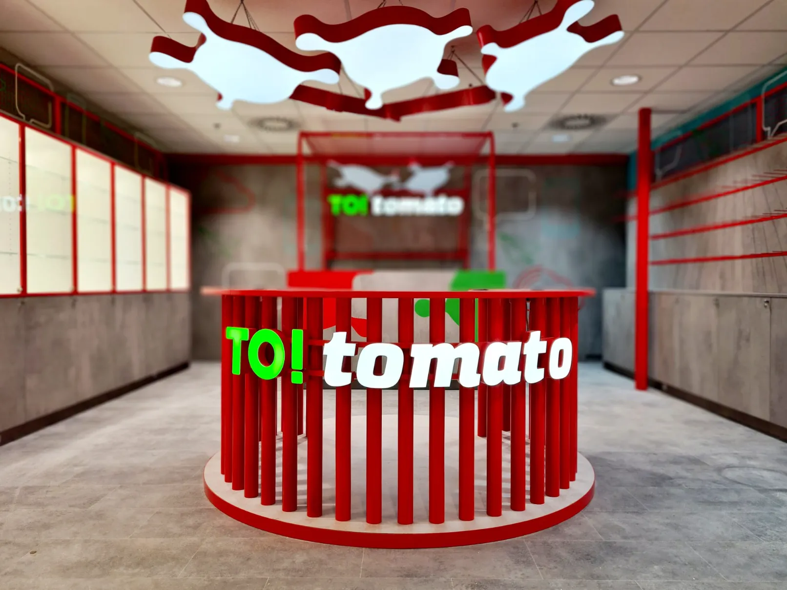 U dizajnu smo krenuli od tomato logotipa tako da je osnova dizajna bila njihov prepoznatljivi „tomato splash“ u obliku kojeg smo izradili podne i viseće lampe te ga aplicirali kao metalne intarzije u prodajne pultove. Elementi za uređaje osmišljeni su kao kružni otoci i podizne vitrine od kaljenog stakla s integriranom rasvjetom.