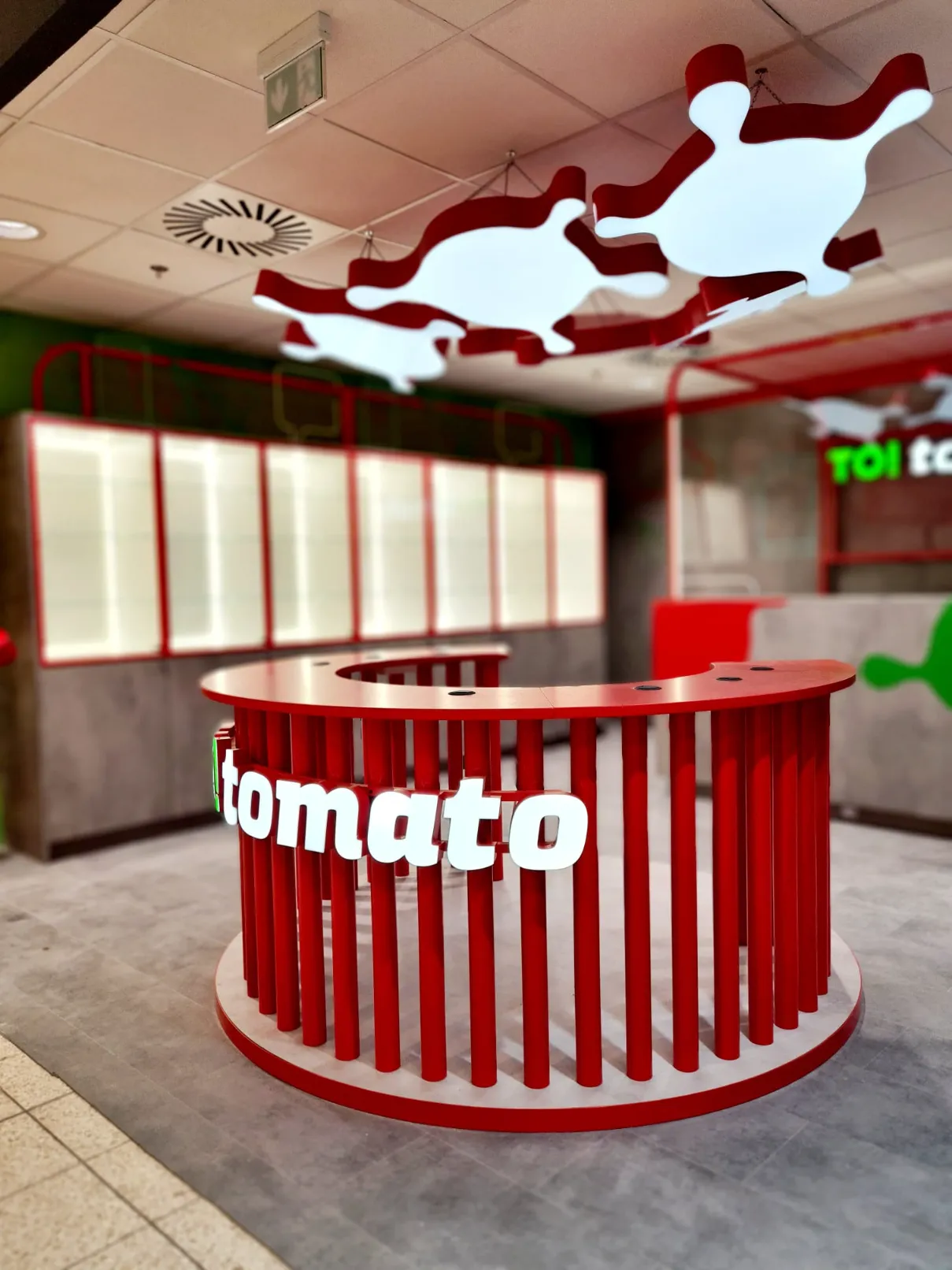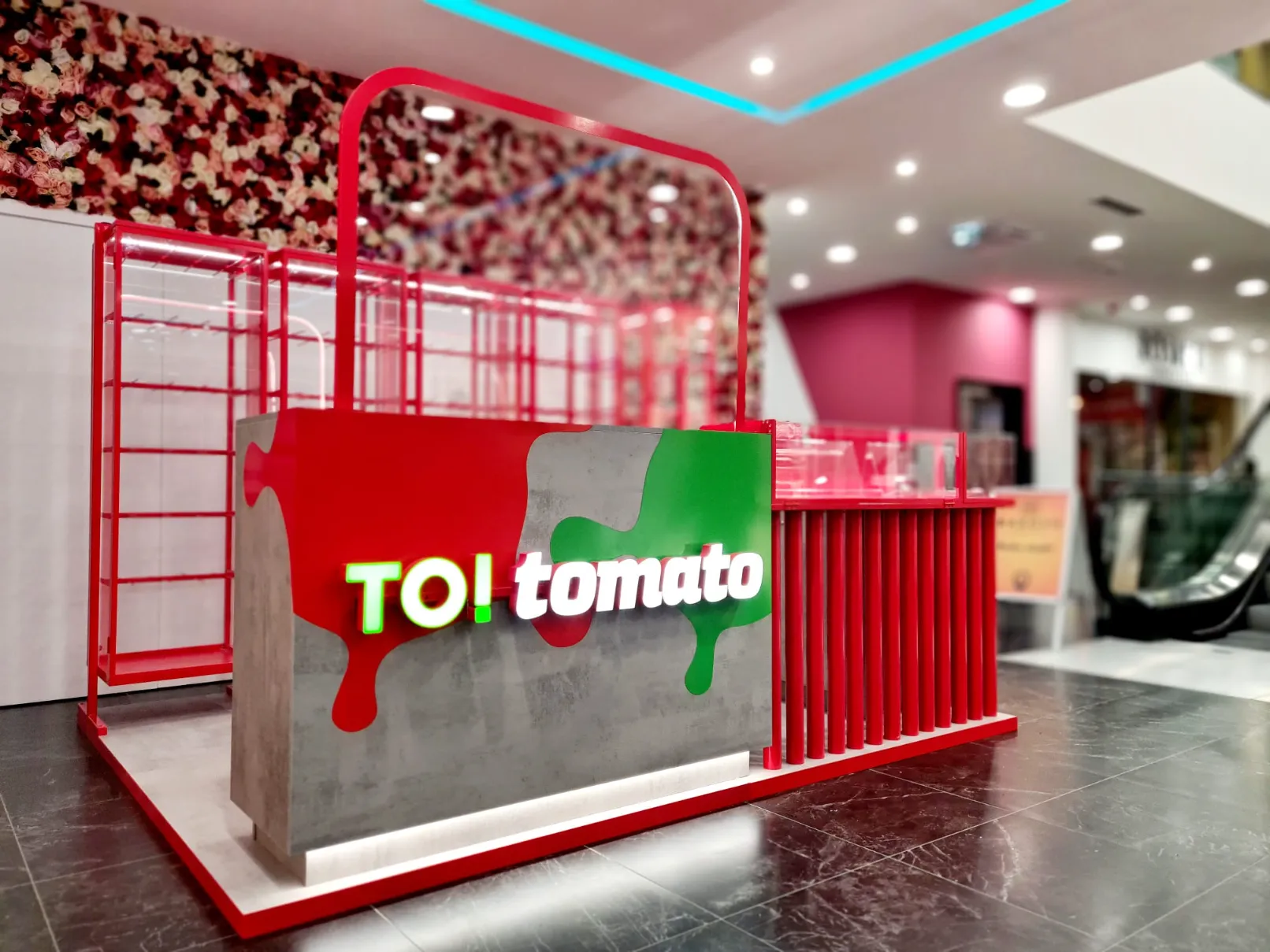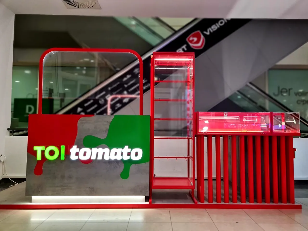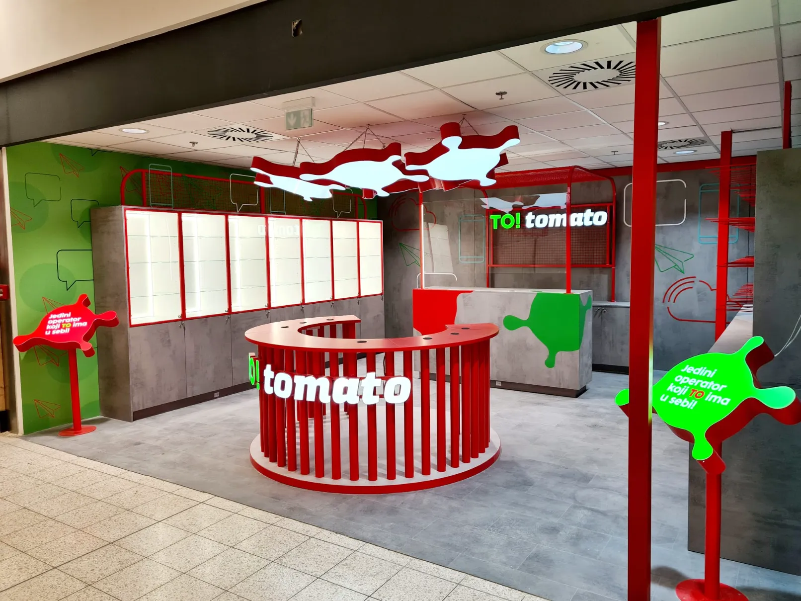 U dizajnu smo krenuli od tomato logotipa tako da je osnova dizajna bila njihov prepoznatljivi „tomato splash“ u obliku kojeg smo izradili podne i viseće lampe te ga aplicirali kao metalne intarzije u prodajne pultove. Elementi za uređaje osmišljeni su kao kružni otoci i podizne vitrine od kaljenog stakla s integriranom rasvjetom.