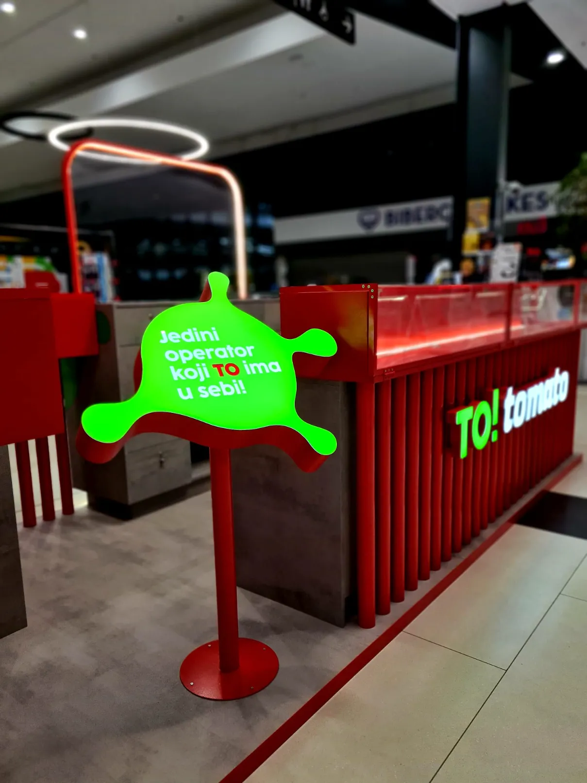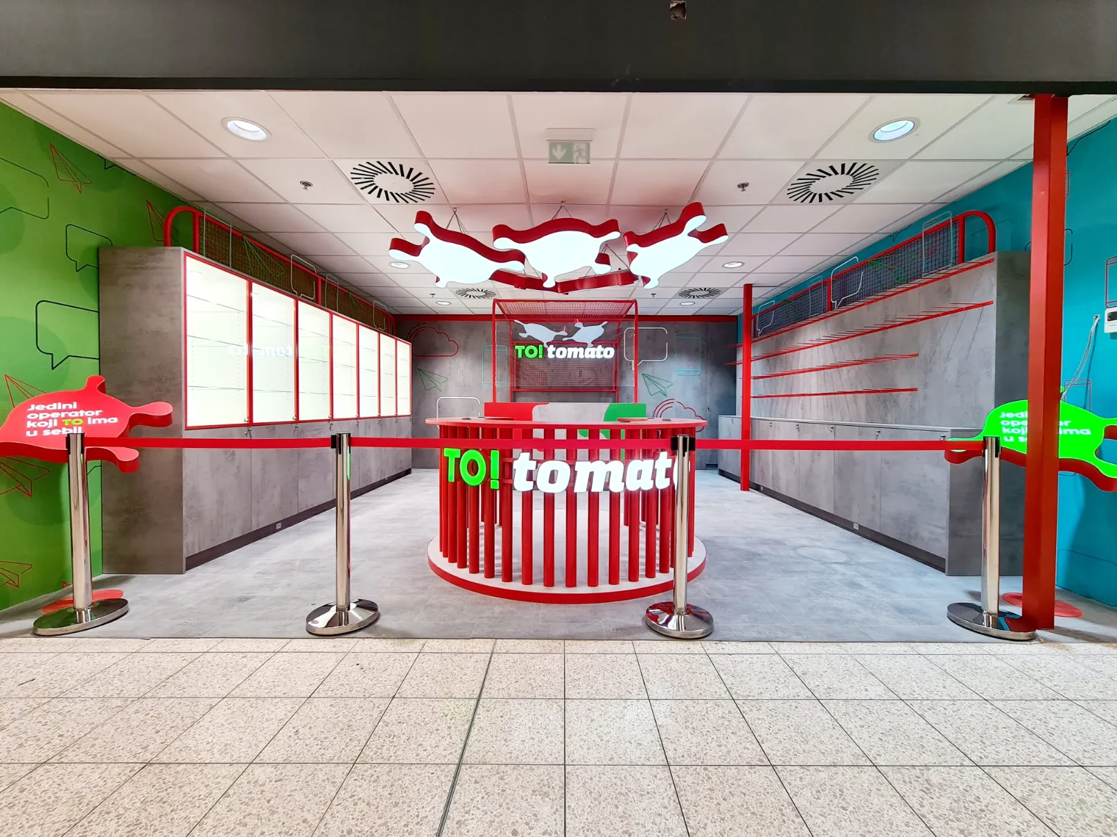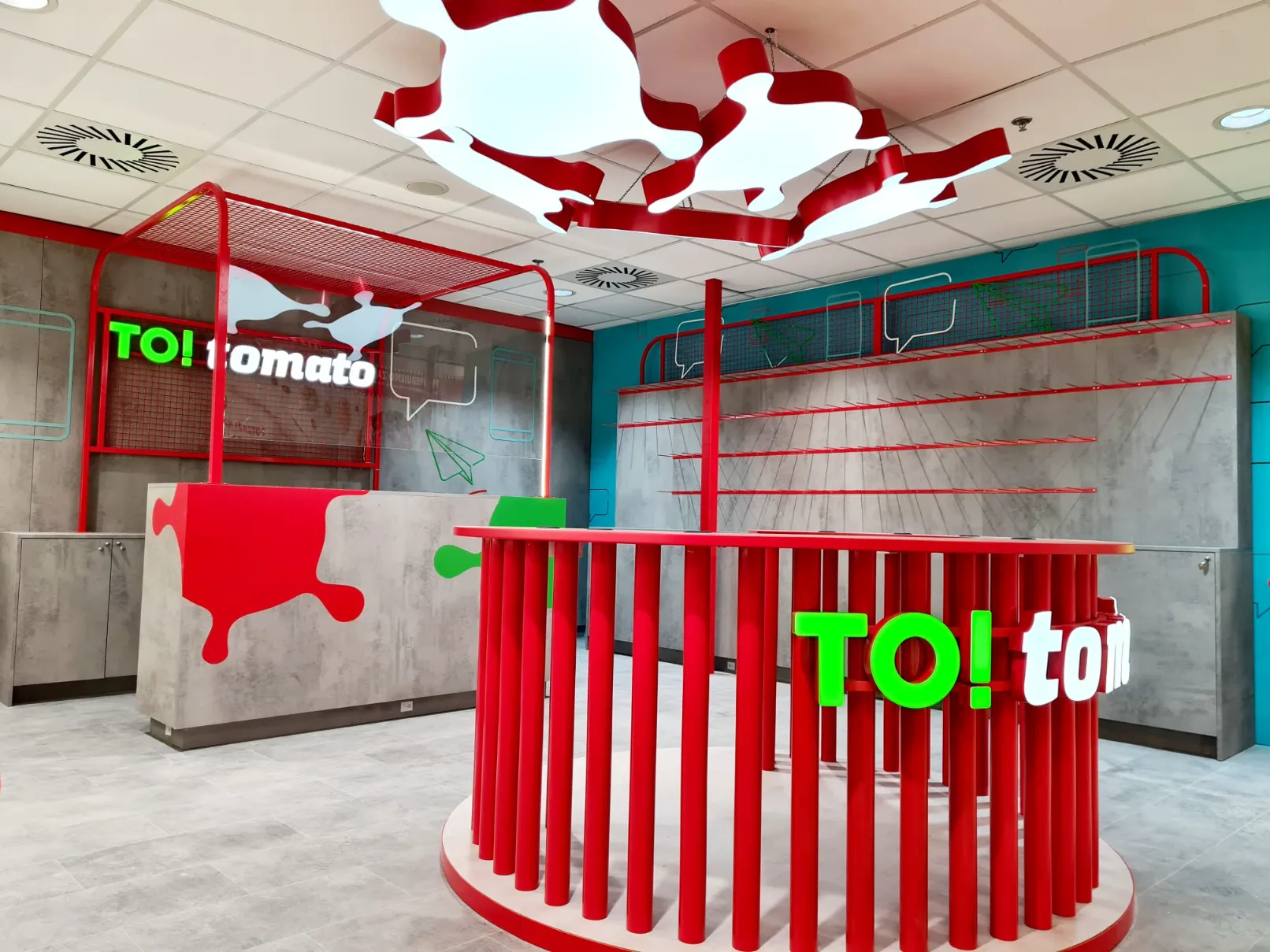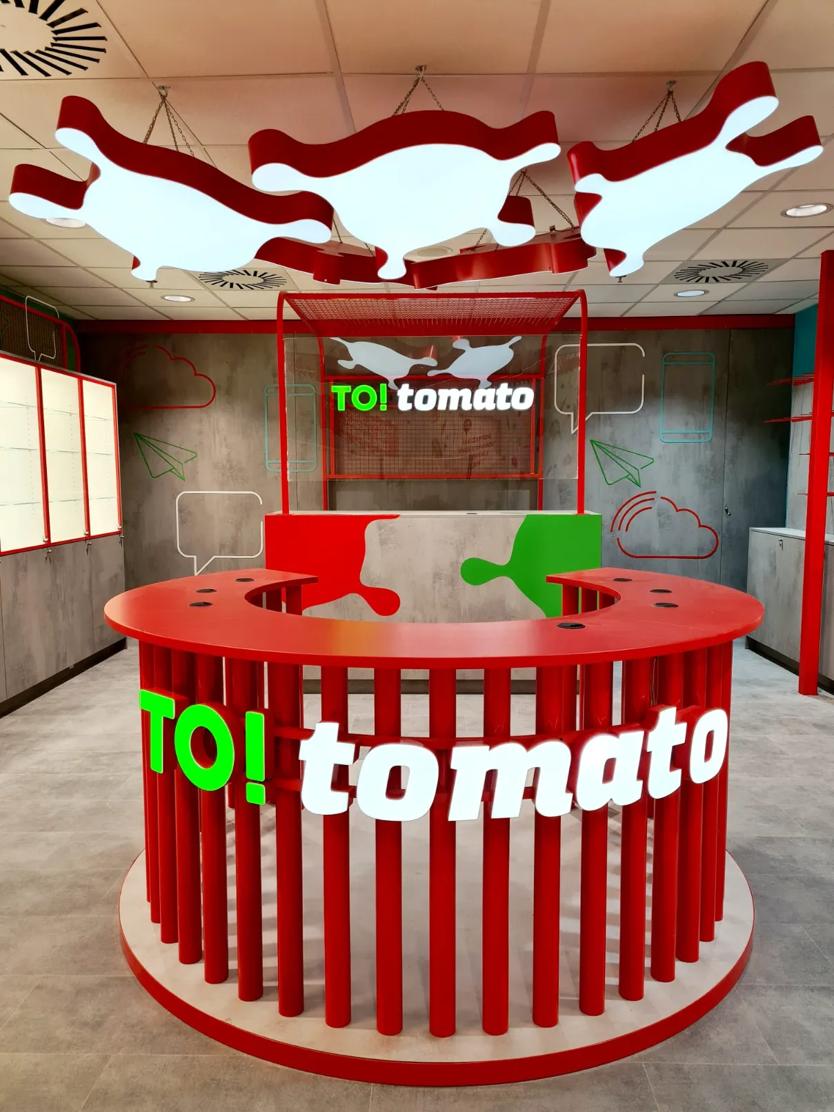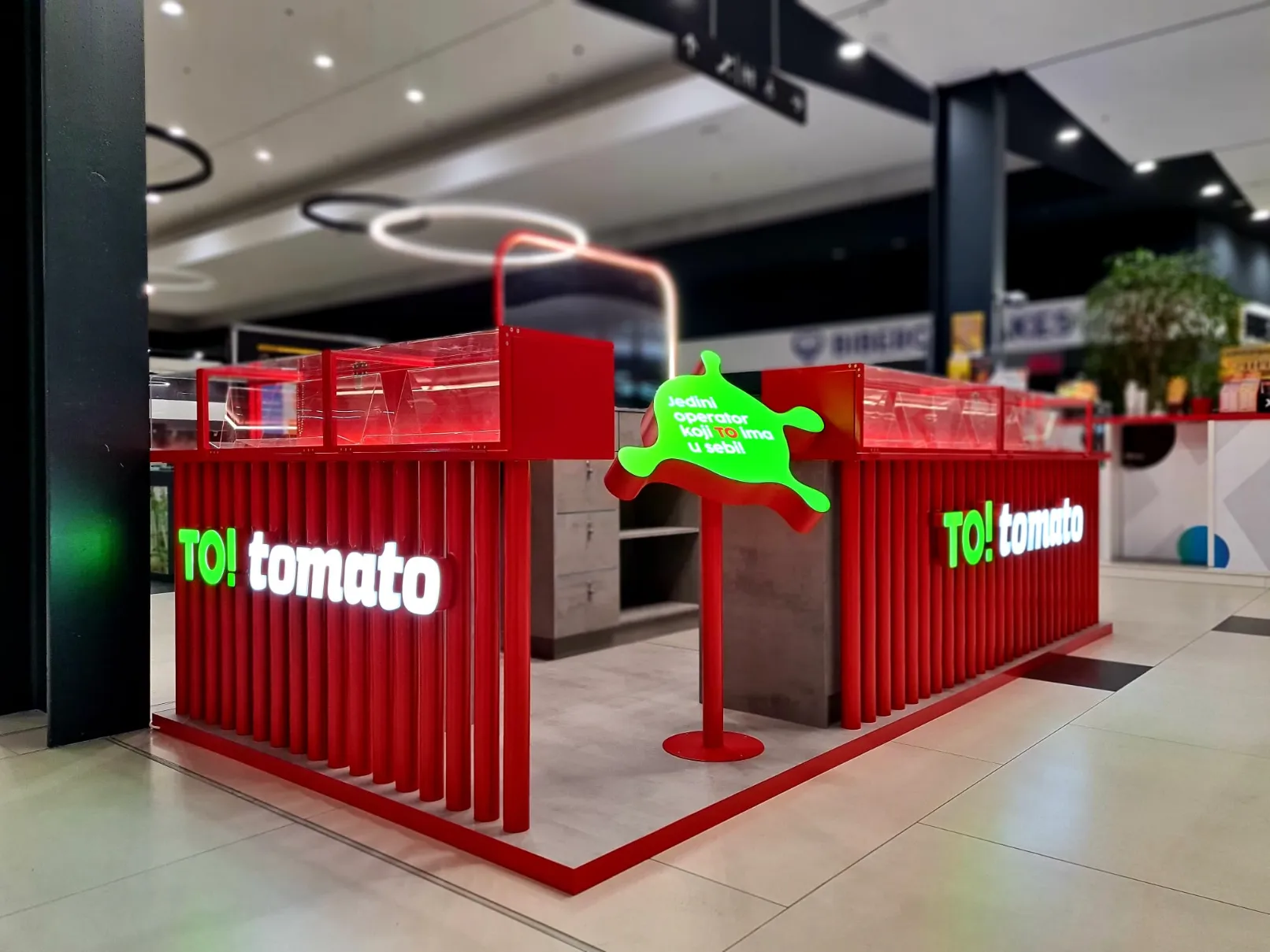 U dizajnu smo krenuli od tomato logotipa tako da je osnova dizajna bila njihov prepoznatljivi „tomato splash“ u obliku kojeg smo izradili podne i viseće lampe te ga aplicirali kao metalne intarzije u prodajne pultove. Elementi za uređaje osmišljeni su kao kružni otoci i podizne vitrine od kaljenog stakla s integriranom rasvjetom.