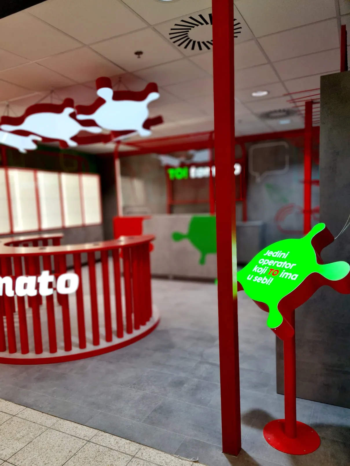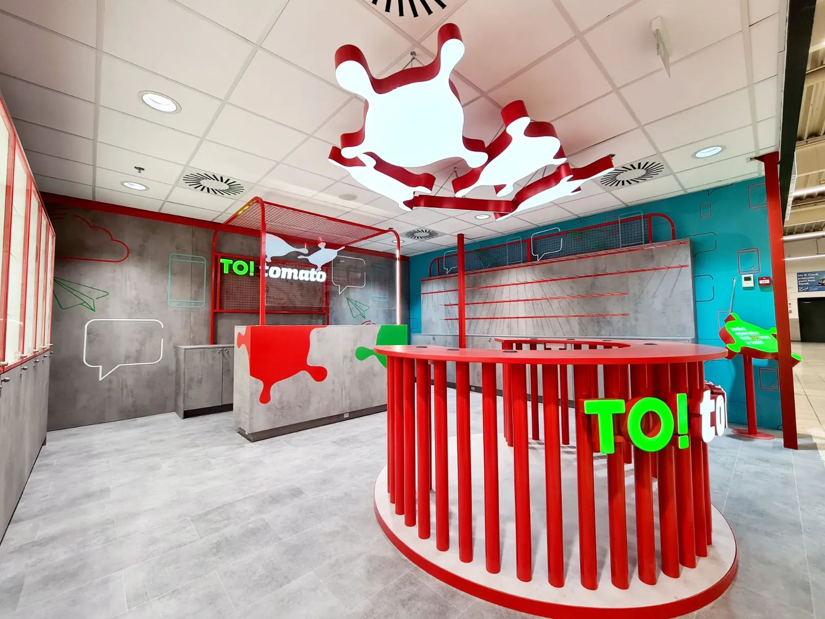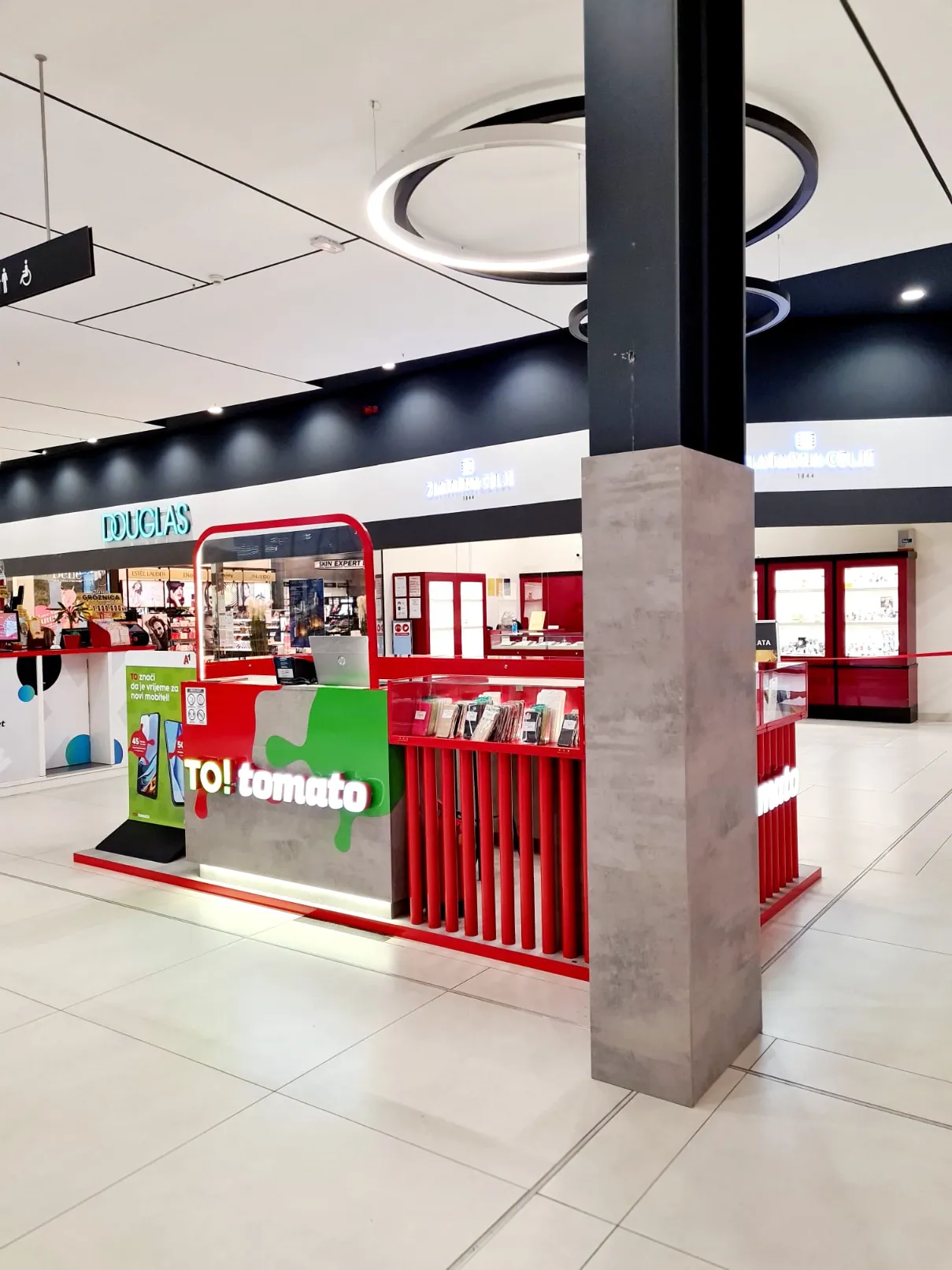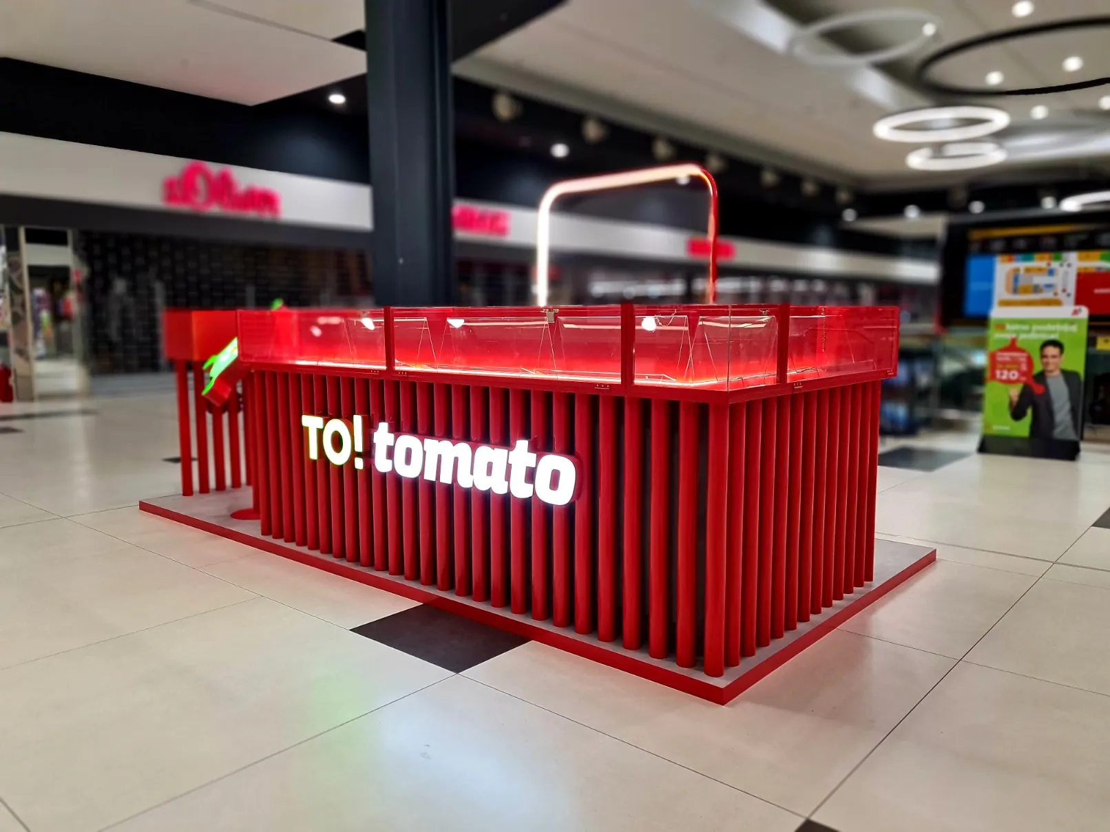 U dizajnu smo krenuli od tomato logotipa tako da je osnova dizajna bila njihov prepoznatljivi „tomato splash“ u obliku kojeg smo izradili podne i viseće lampe te ga aplicirali kao metalne intarzije u prodajne pultove. Elementi za uređaje osmišljeni su kao kružni otoci i podizne vitrine od kaljenog stakla s integriranom rasvjetom.