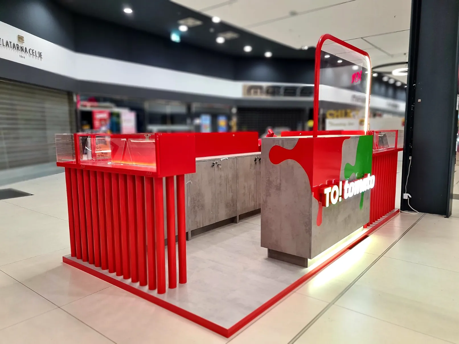 Za klijenta A1 dizajnirali smo i proizveli opremu za nove tomato dućane diljem Hrvatske. Zadatak je bio definirati standardizaciju novih tomato dućana – kao klasični dućan i kao otočne pozicije u shopping centrima.